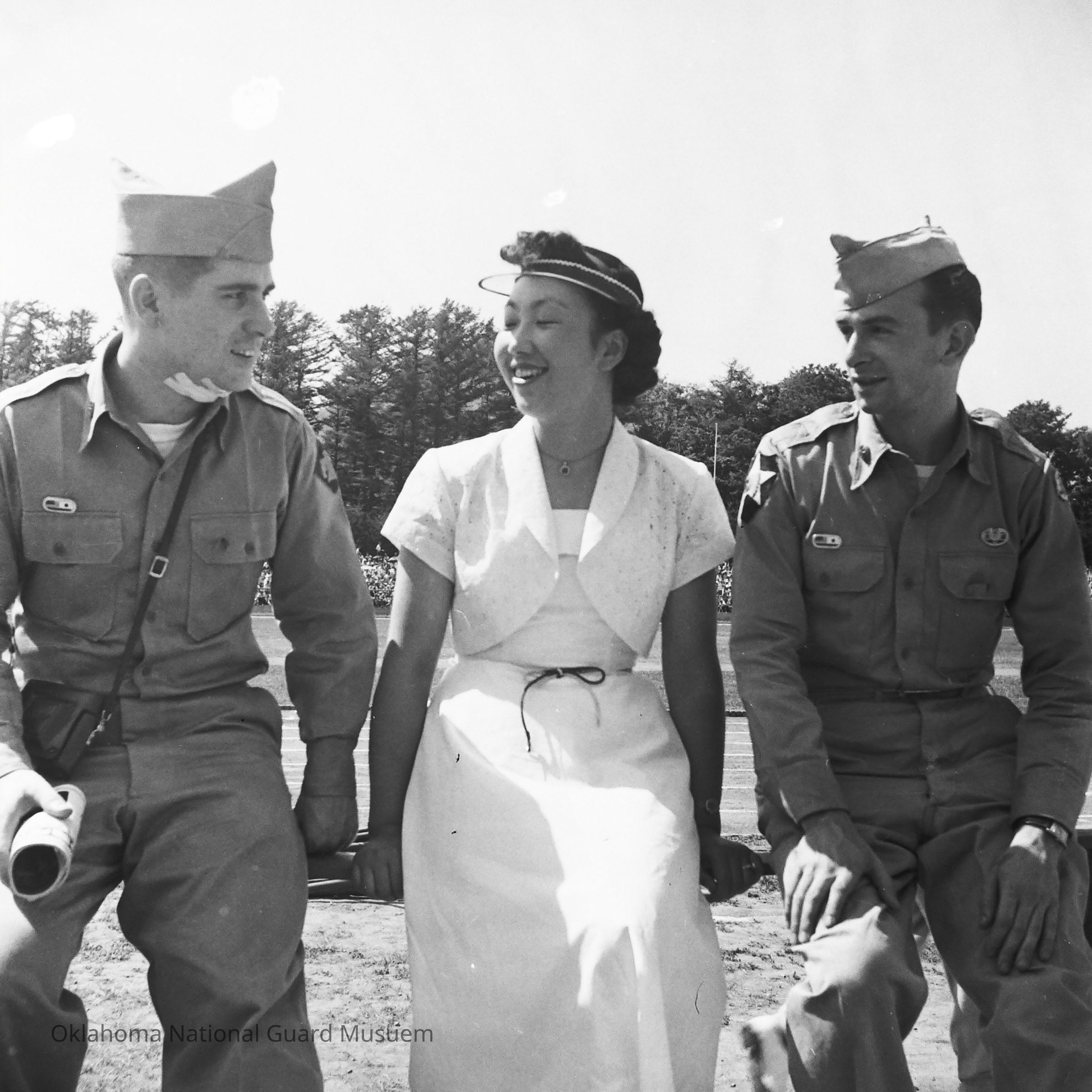 Negative of soldiers sitting with a Japanese woman during a track event