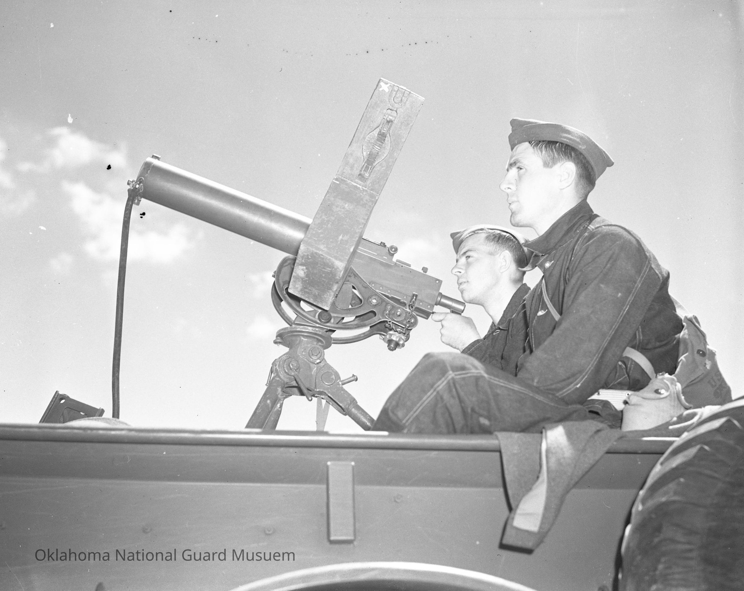 Negative of soldiers sitting with a truck-mounted machine gun