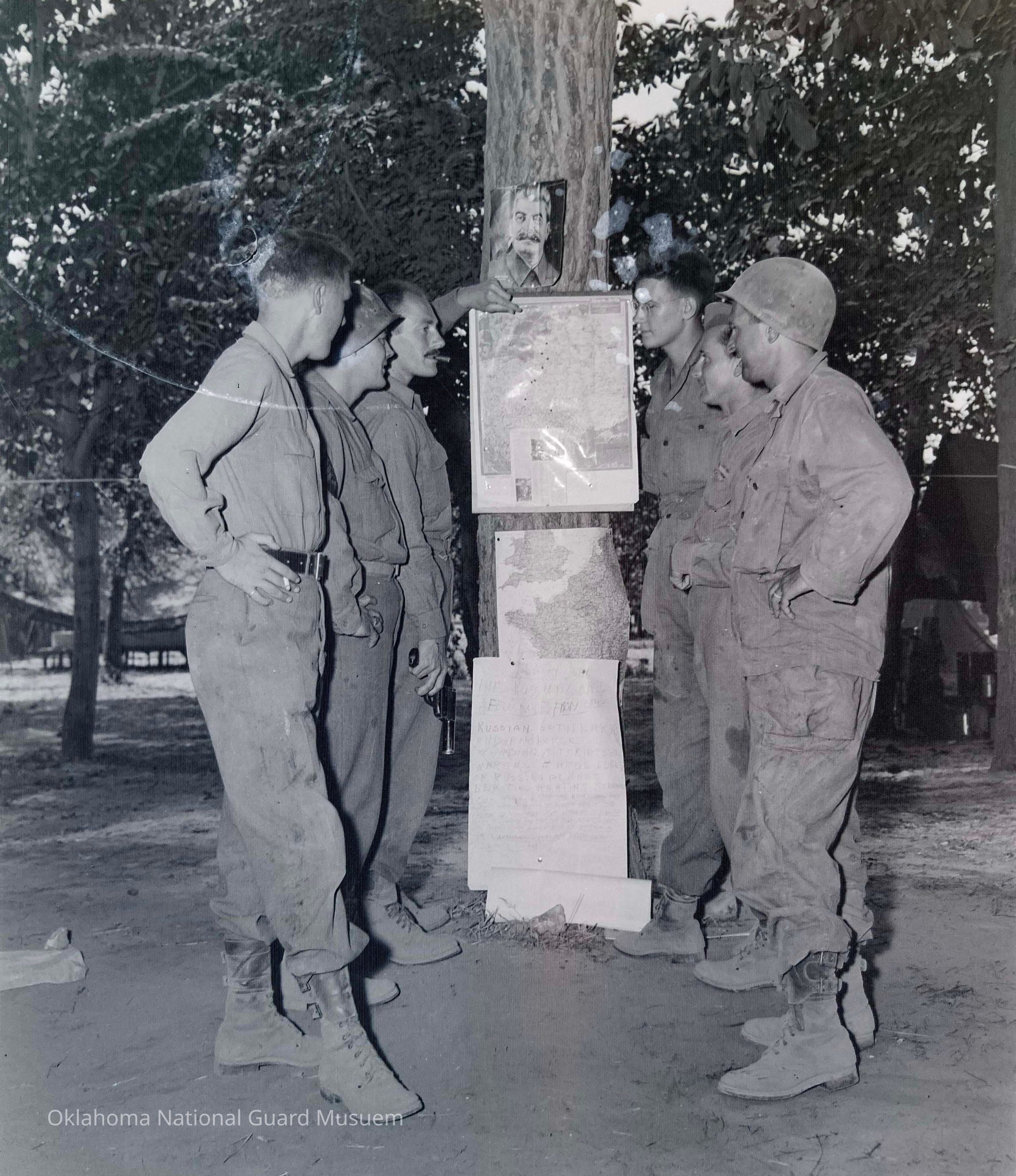 Negative of soldiers standing around a tree with maps and a picture of Joseph Stalin hung on it