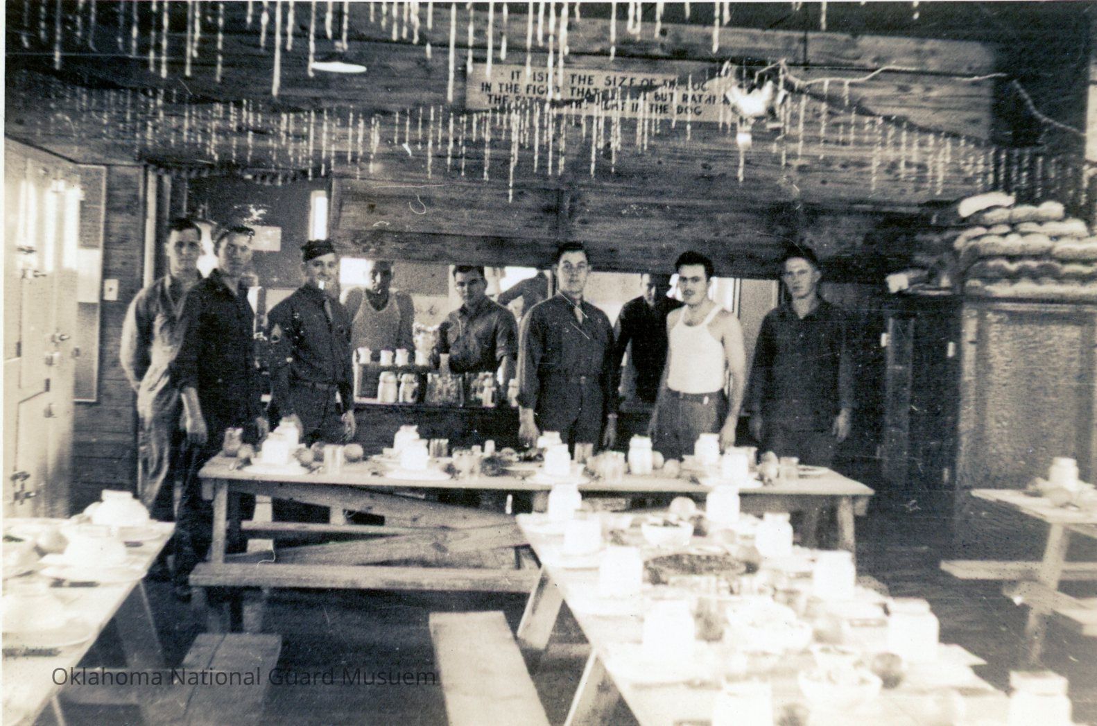 Group of soldiers standing in a mess hall with the tables set for dinner