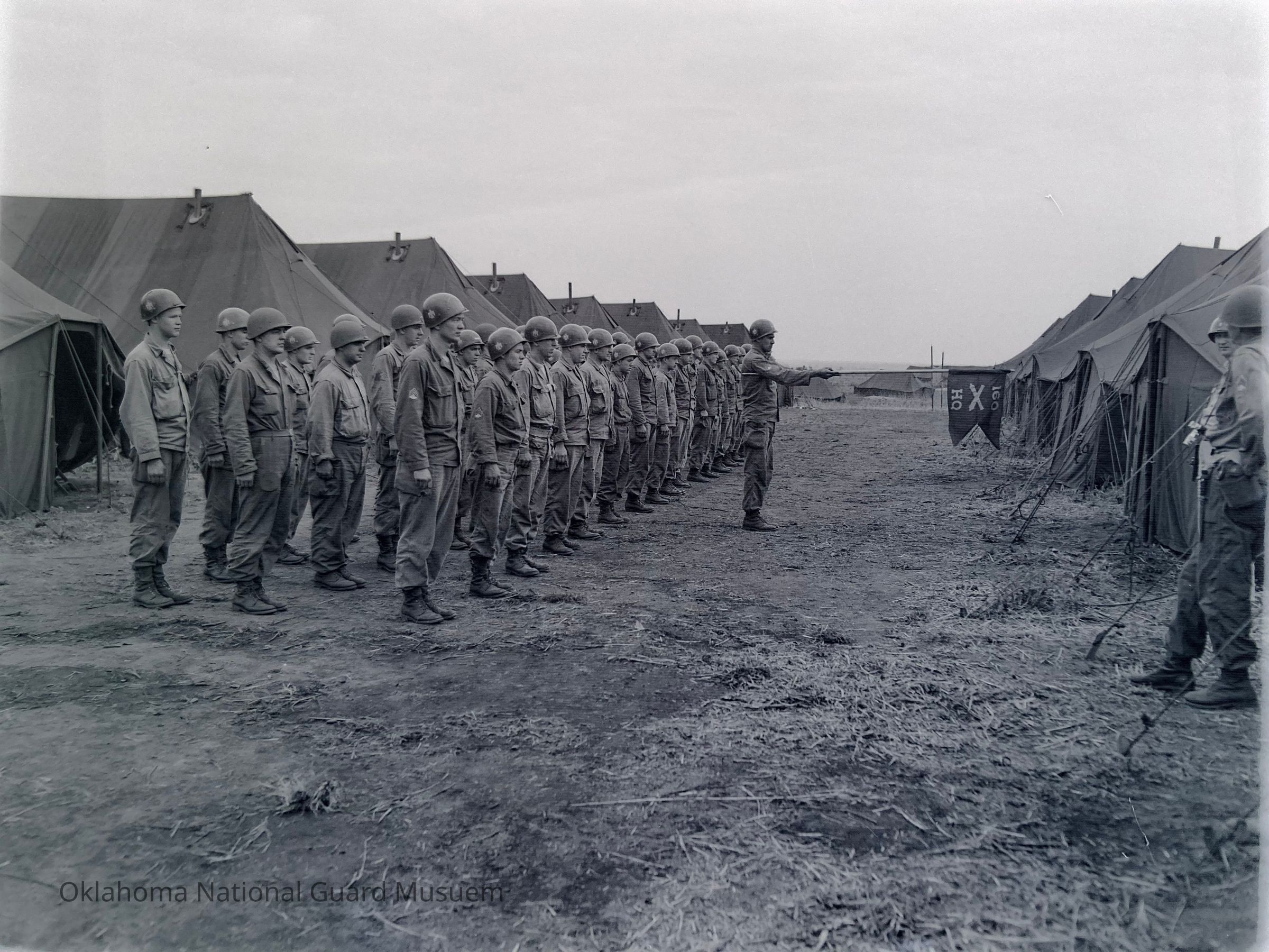 Negative of soldiers standing in formation in camp. HQ Company 160th Field Artillery