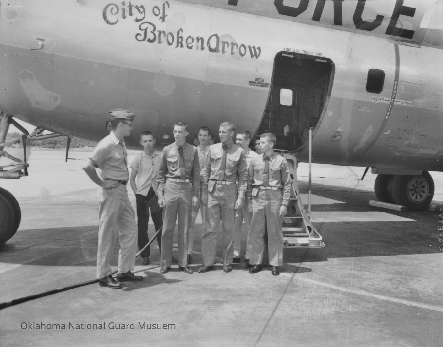 Soldiers standing in front of C-97 aircraft. 138th Air Transport Group. "City of Broken Arrow" painted on the side