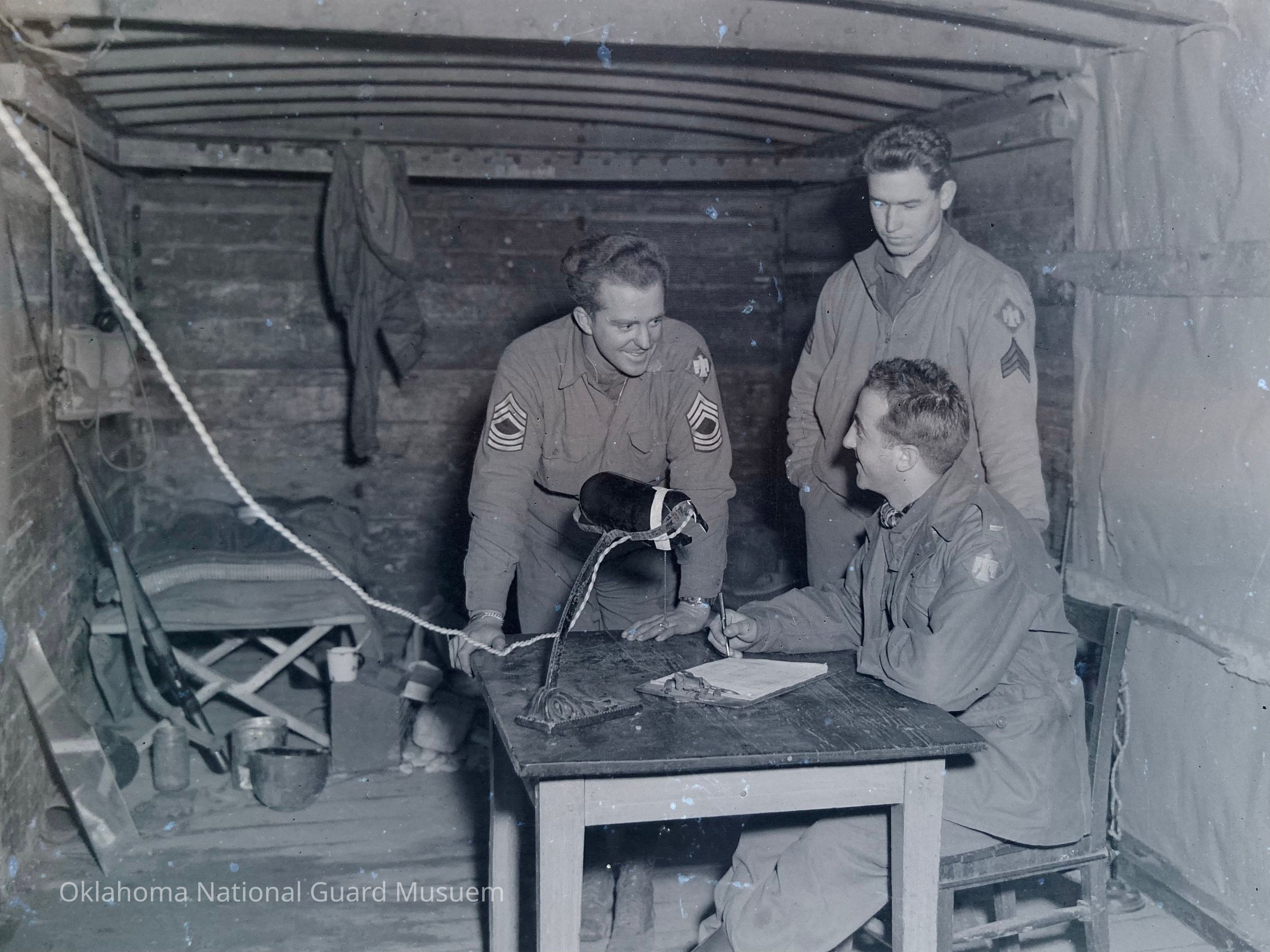 45th Division News Vol V No. 19 "There may not be chintz curtains on the windows because there aren't any windows, but this Kraut box car has been converted into a warm, dry home for three GIs in a regimental service company. (Left to right) James Valentine (Oklahoma City, Oklahoma), Lawrence Cady (Boston, Massachusetts), and Robert Bickerstoff (Oklahoma City, Oklahoma)Made/Created