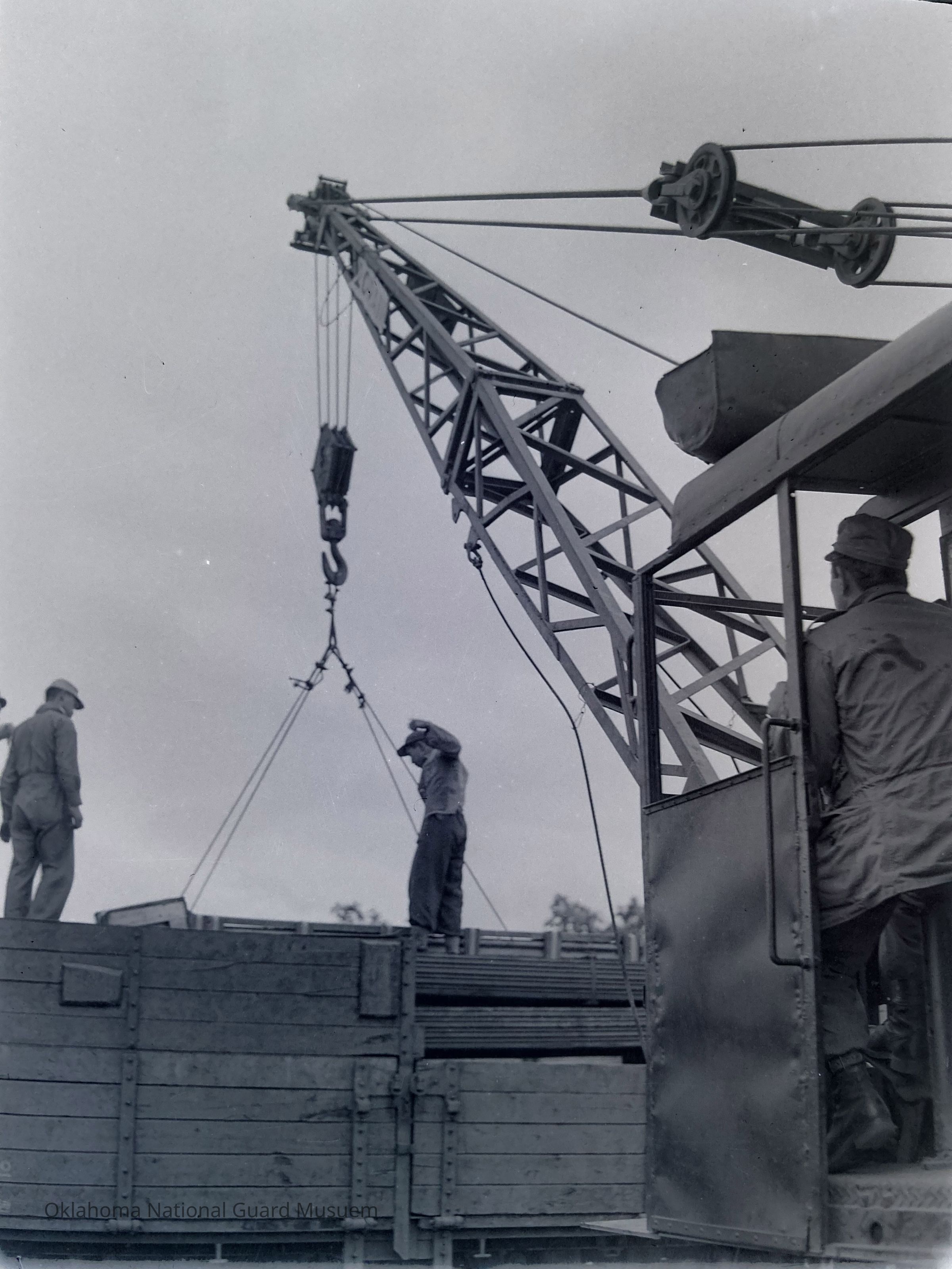 Negative of soldiers using a crane to load cargo on Hokkaido, Japan.