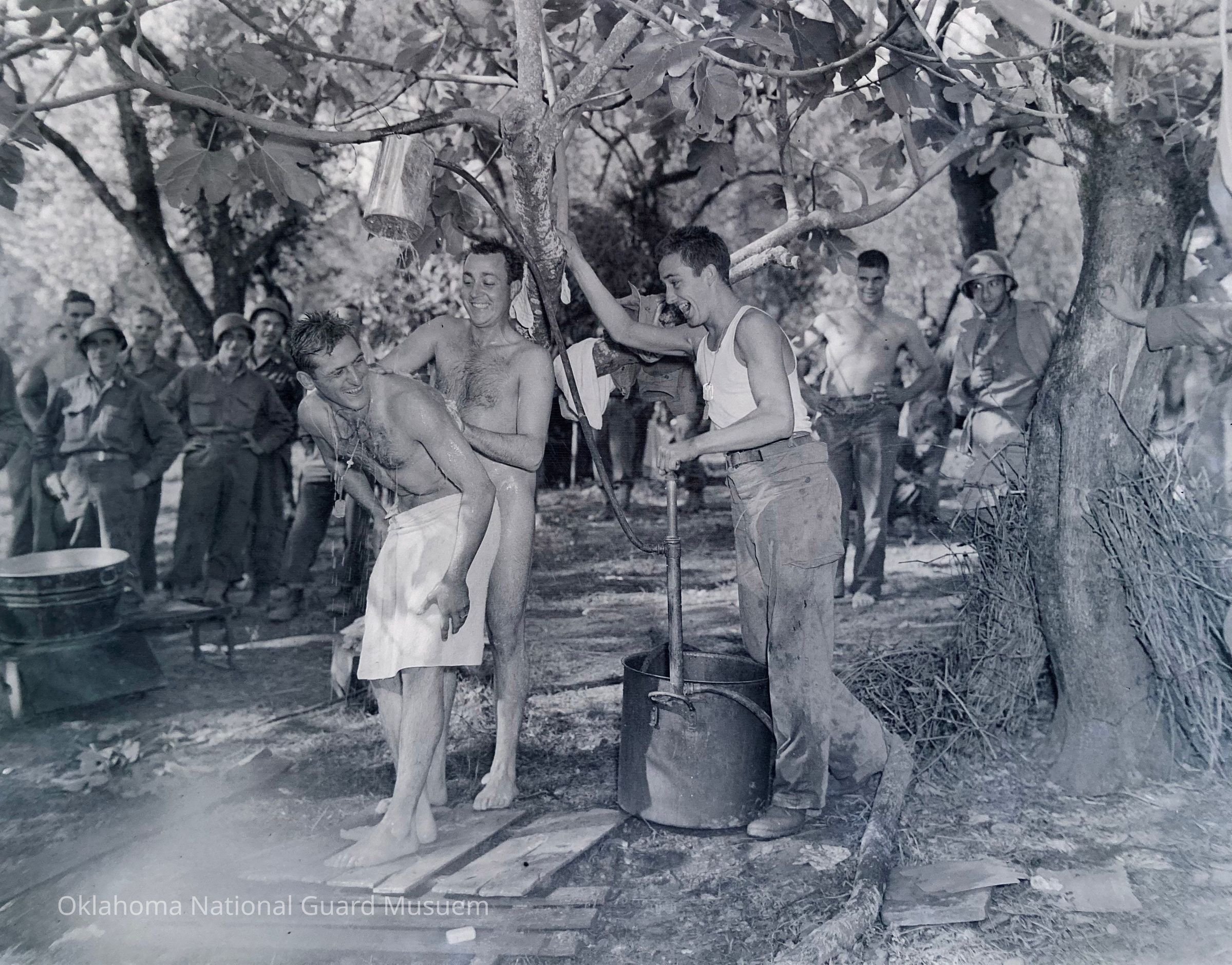 Photograph published in the 45th Division News, 27 November 1943, Vol. IV, No. 20, Caption "Paddlefeet are always on the lookout for more comfortable ways to do things, as can be seen in this homemade shower. A GI stove heats the water in a large dixie, a pump from a quarter-ton amphib pumps it from the dixie to a gallon can suspended over the bathers' heads, and the hot shower is complete. The figure with the towel is Pvt. Amerigo Bosso, Brooklyn, NY, and soaping Bosso's back is Pvt. William Pastore, Long Island, NY. The pumper inventor is Pvt. James Thyden, Worcester, MA."Made/Created
