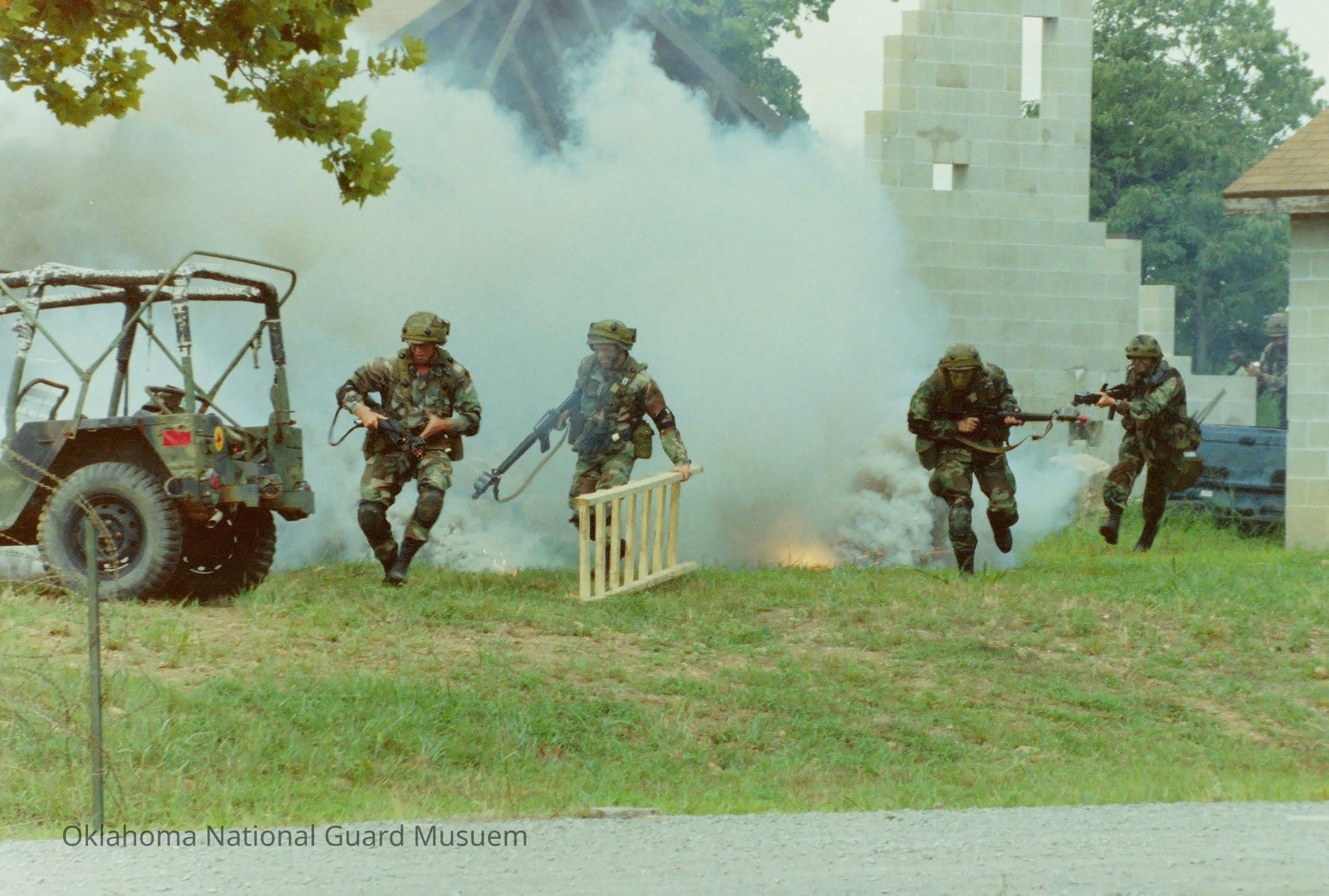 Negative of soldiers using smoke as cover in training village
