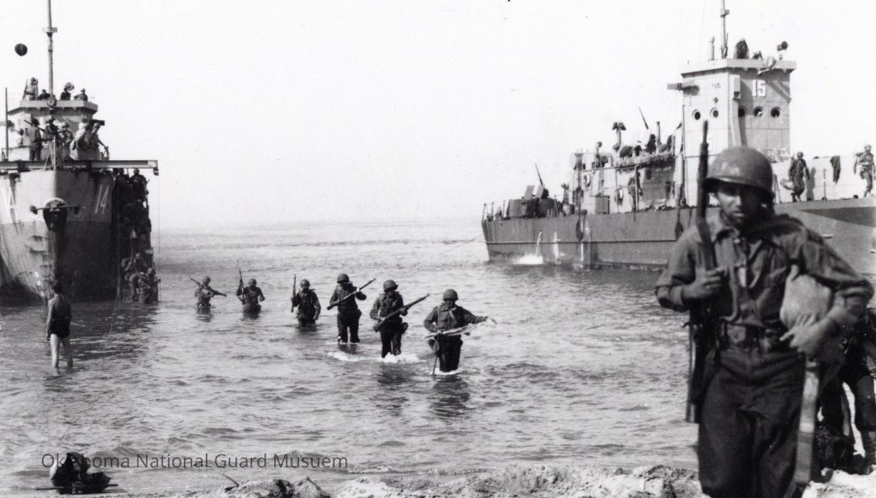 Members of the 179th Infantry Band wading ashore