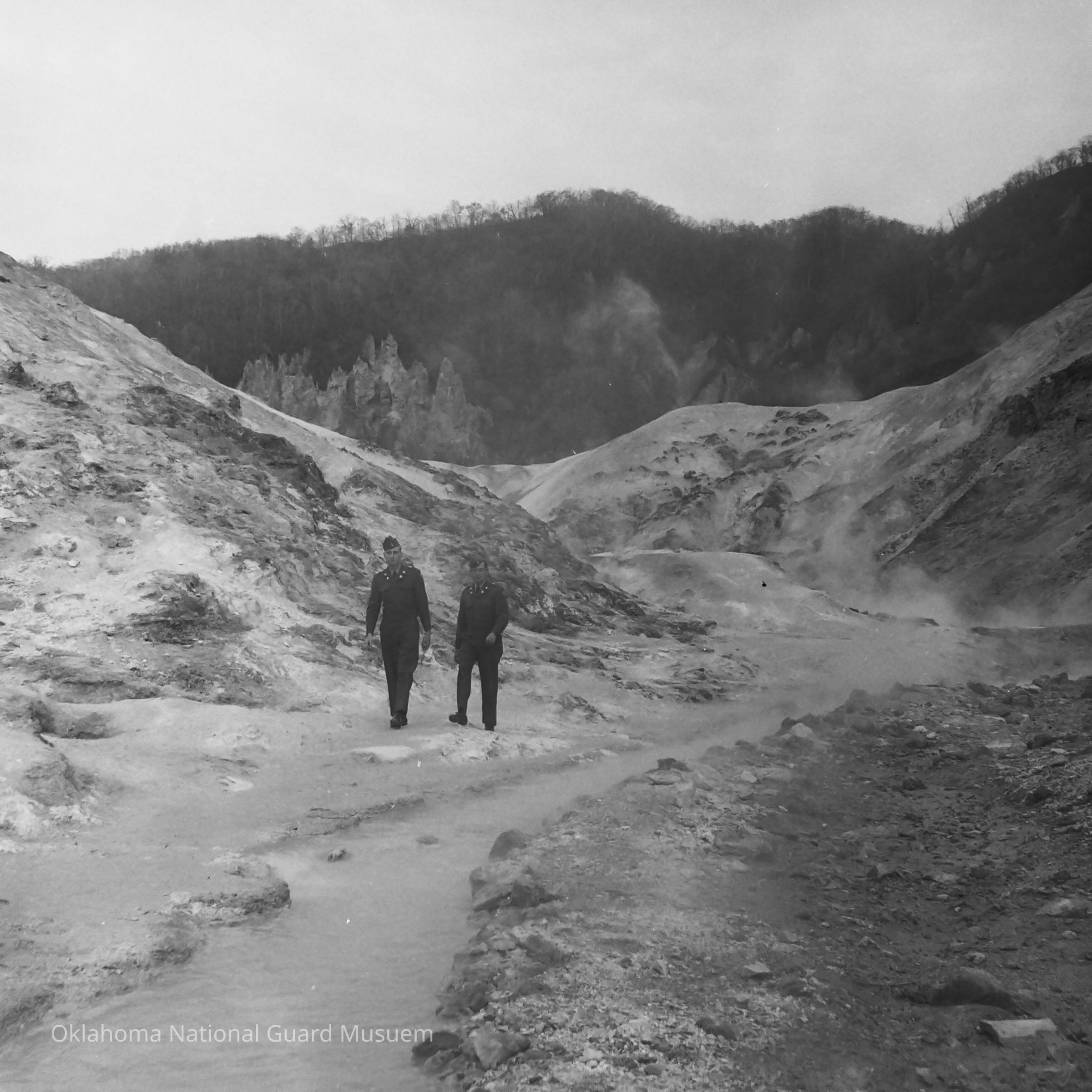 Negative of soldiers walking among hot springs near Noboroibetsu Hotel
