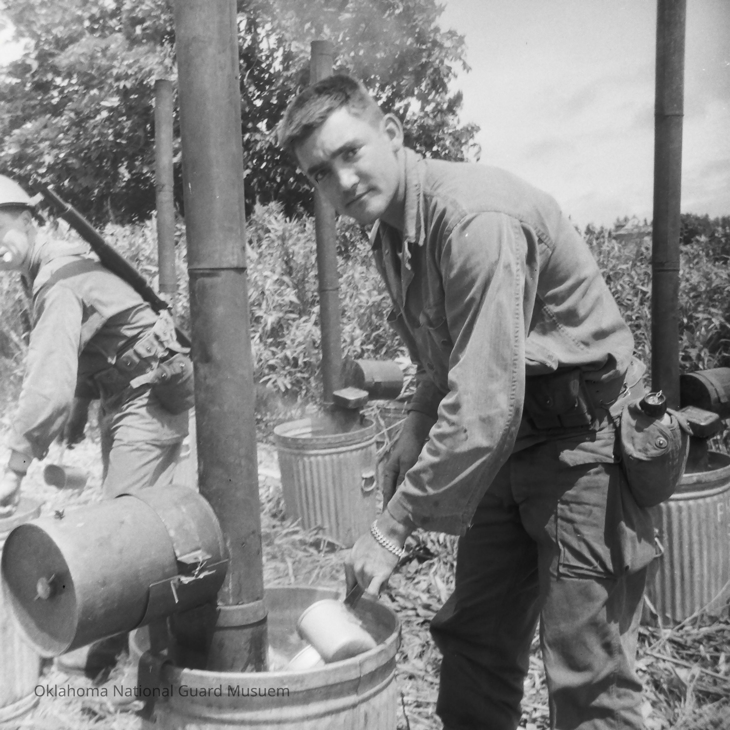 Soldiers washing their mess gear in wash cans with immersion heaters