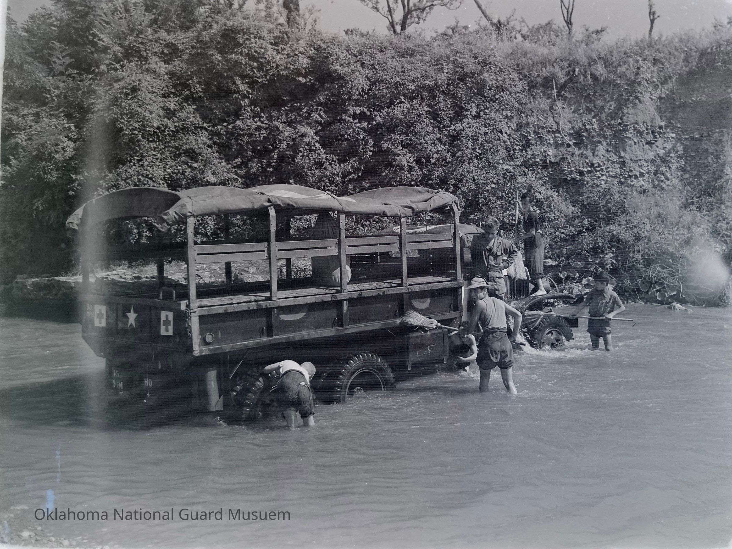 Negative of soldiers washing 2 1/2-ton truck in a river