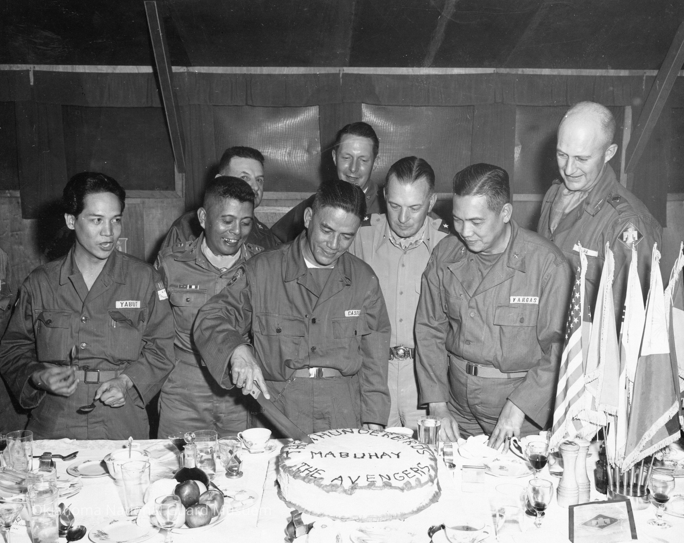 Soldiers of the 14th Battalion Combat Team ("Avengers") cut a cake as Thunderbirds watch on. General P.D. Ginder in centerPhotograph Details