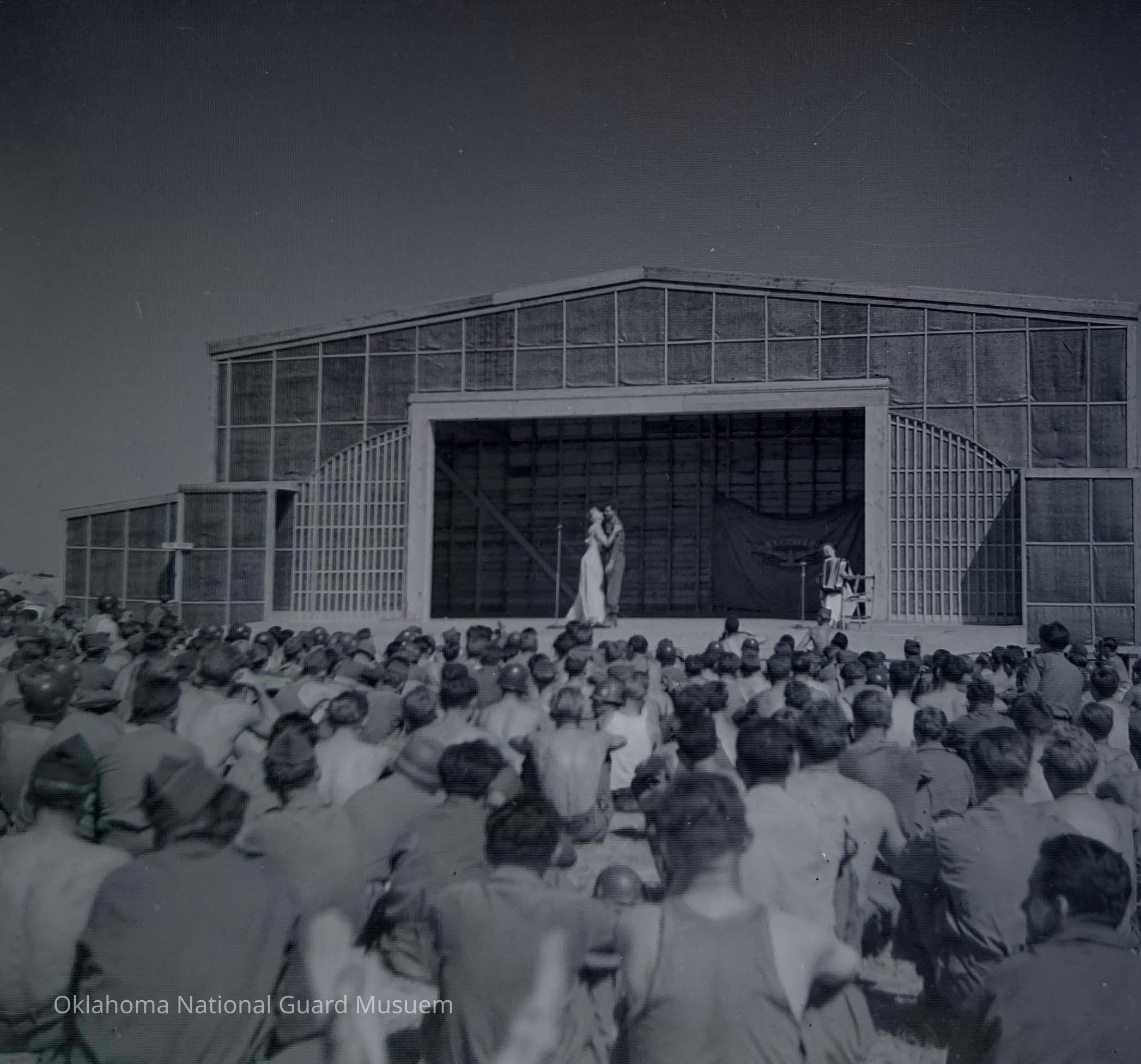 Negative of soldiers watching entertainers on stage