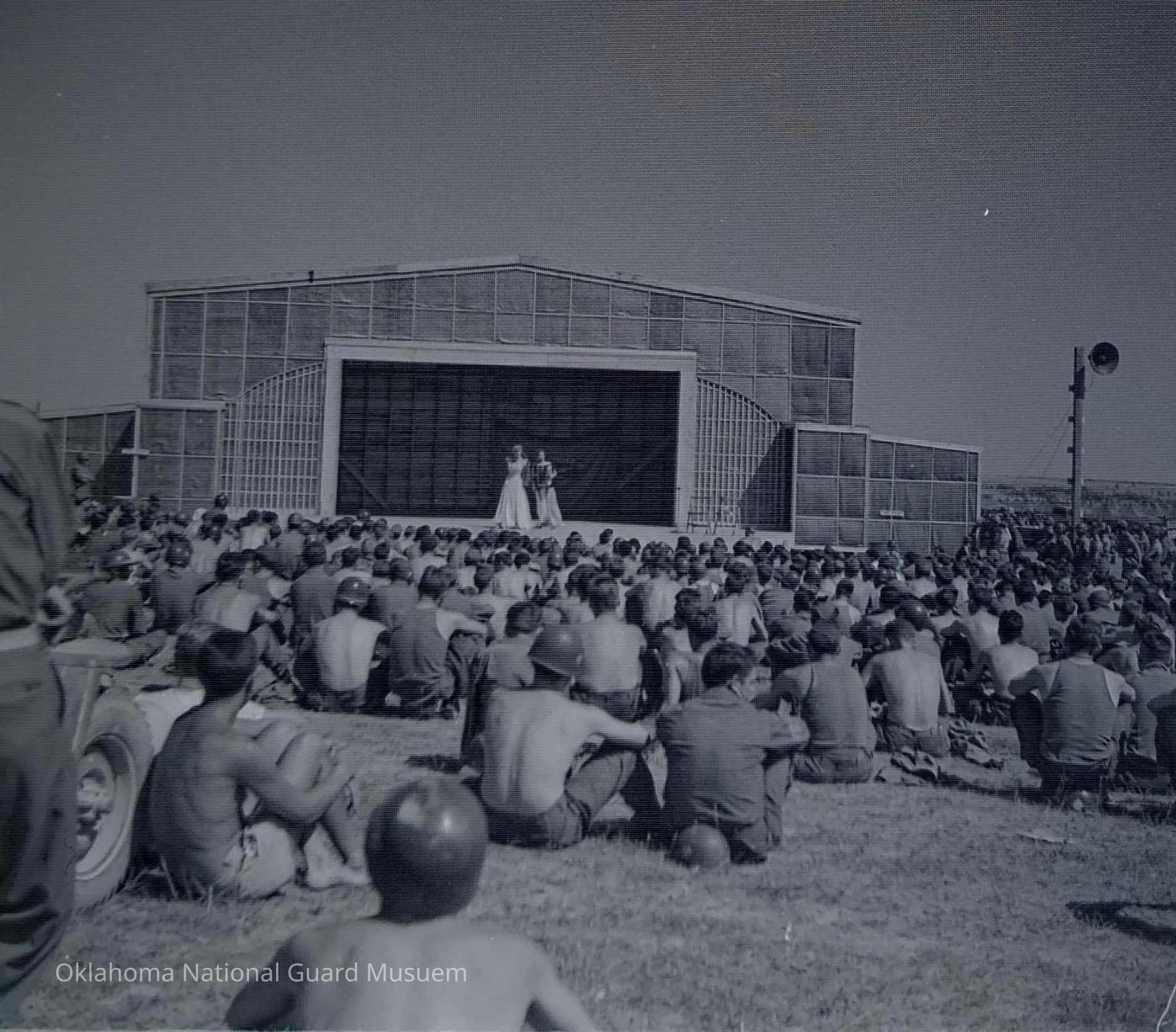 Negative of soldiers watching entertainers on stage