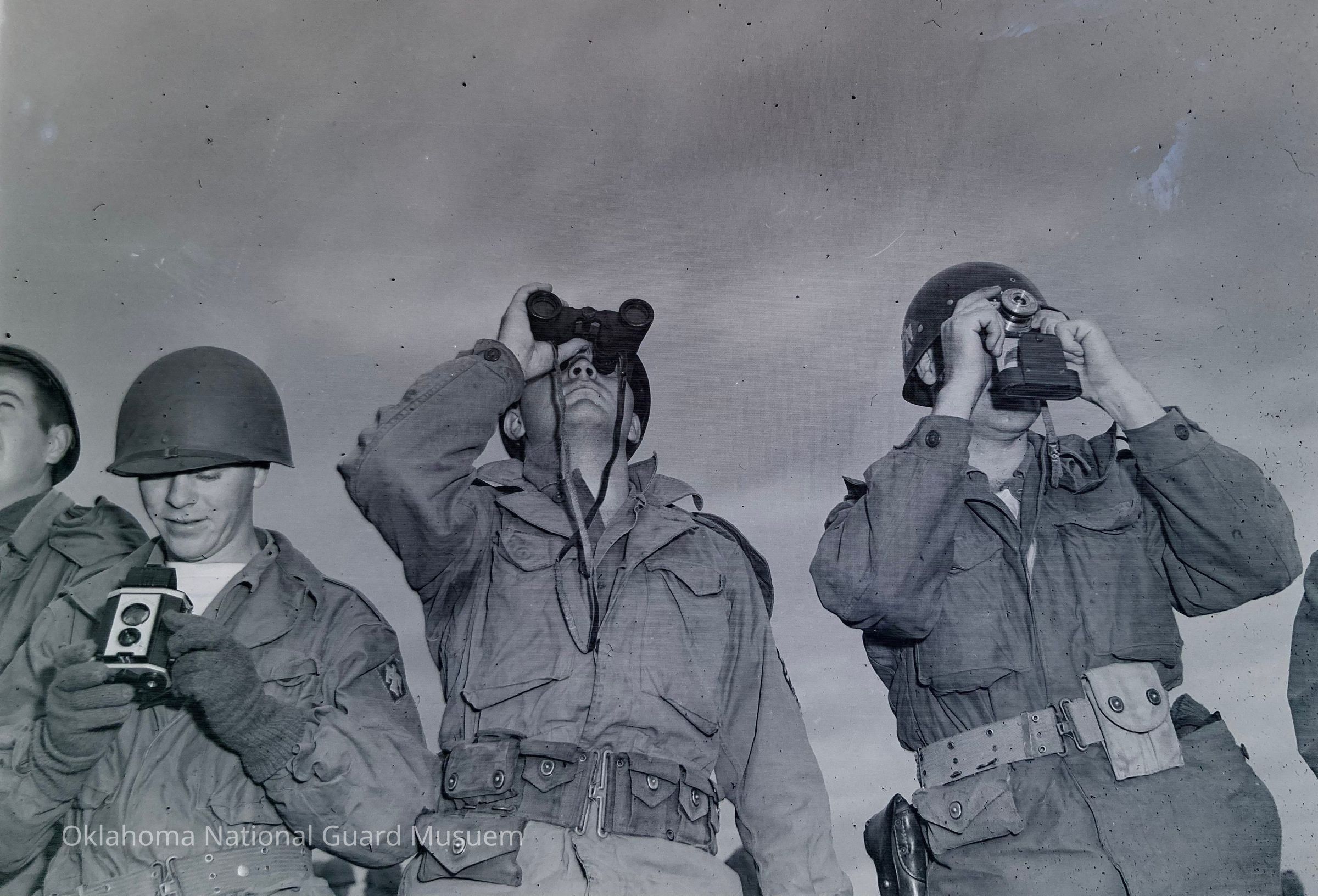 Negative of soldiers watching the parachute training. 45th Special Forces