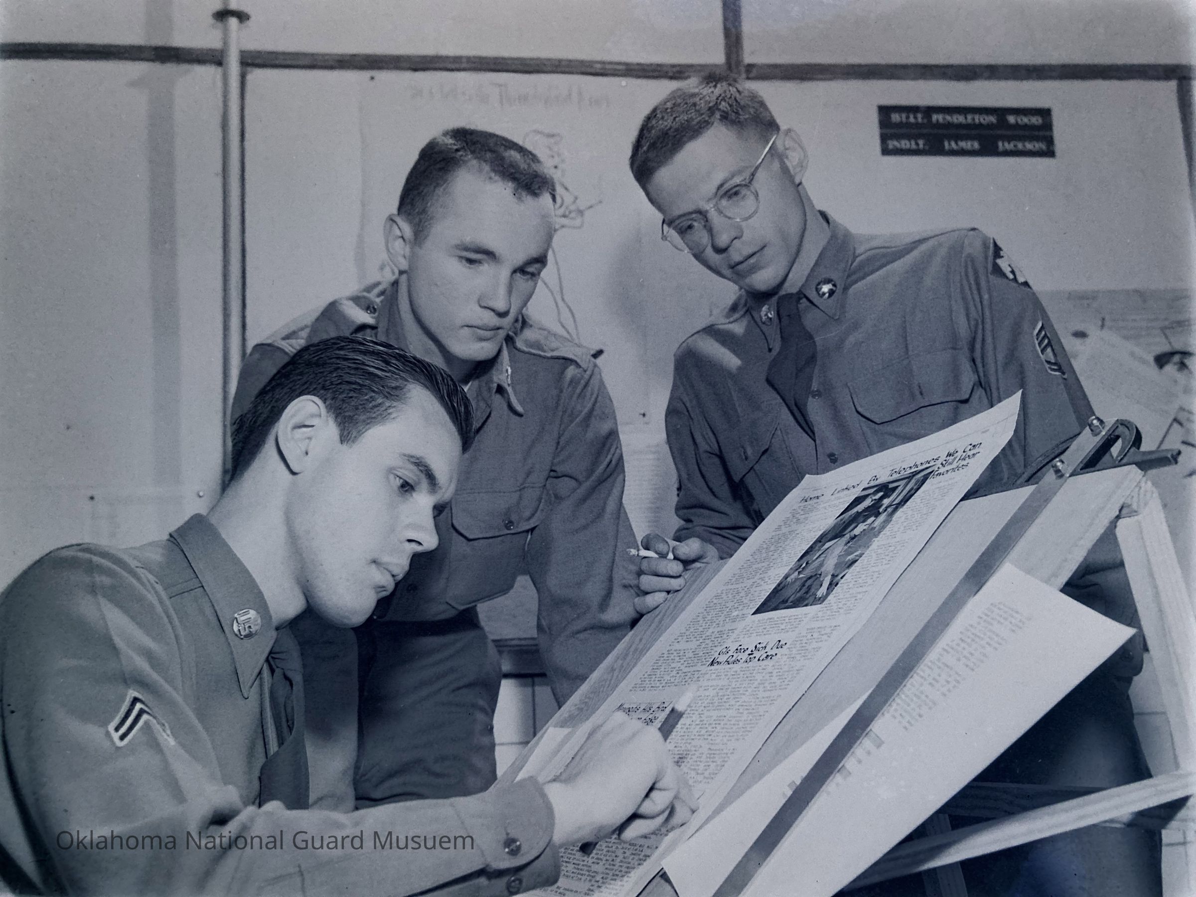 Negative of soldiers with a newspaper layout board on Hokkaido, Japan