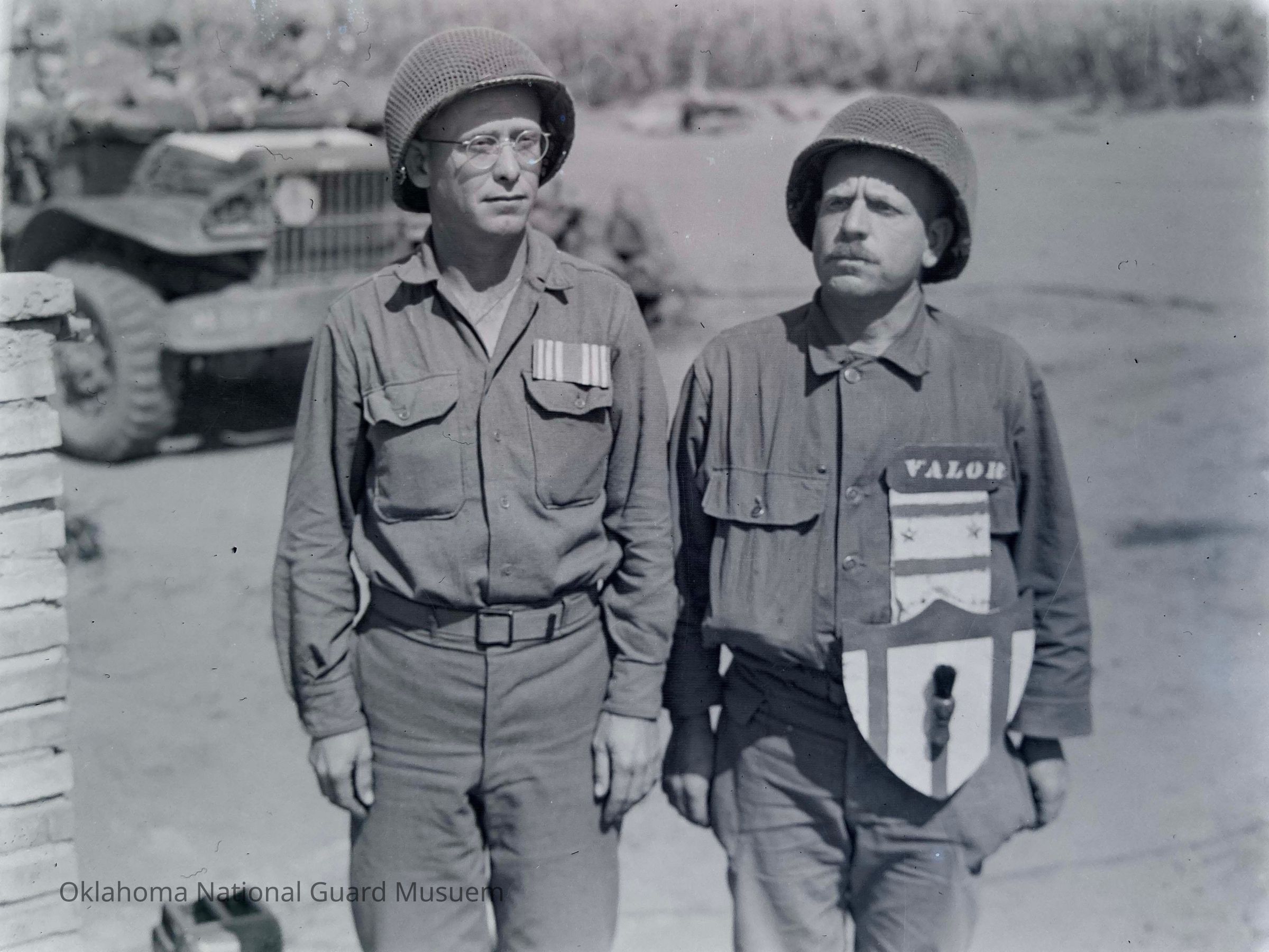 Published in the 45th Division News, 6 May 1944, Vol. IV, No. 37, Caption "Pvt. William Moore, Oklahoma City, company barber for one of the Medic Companies, felt that some of the boys in his outfit had been slighted when they weren't given good conduct ribbons. He gathered up all of the pasteboard he could find, cut them into the proper shapes, painted the red and white stripes on them, then notified the 12 ribbonless men in the company that there would be a formation that afternoon. The time came and Moore presented the ribbon to the men, making an appropriate speech with each. When he was through, one of the men stepped out of the ranks and pinned the Valor ribbon on him. The gist of the speech that went with the award was 'For conspicuous bravery while shaving customers during shelling. Pvt. Harold Brewster, Stringtown, OK (left) Moore (right)Made/Created