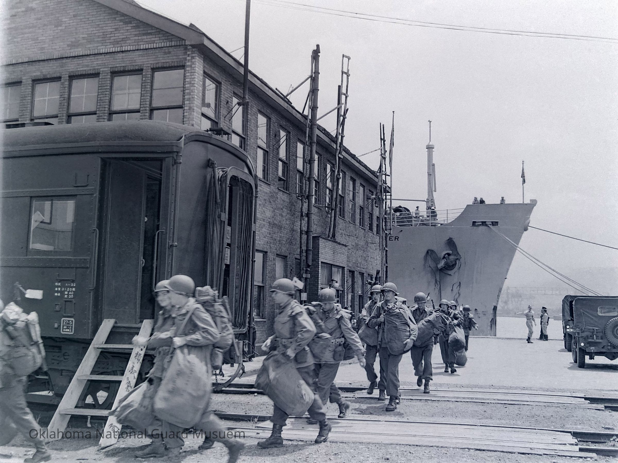 Soldiers, Rifles, Equipment & supplies, Baggage, Luggage, Ships, Transportation, Docks, Trains, Army jeeps