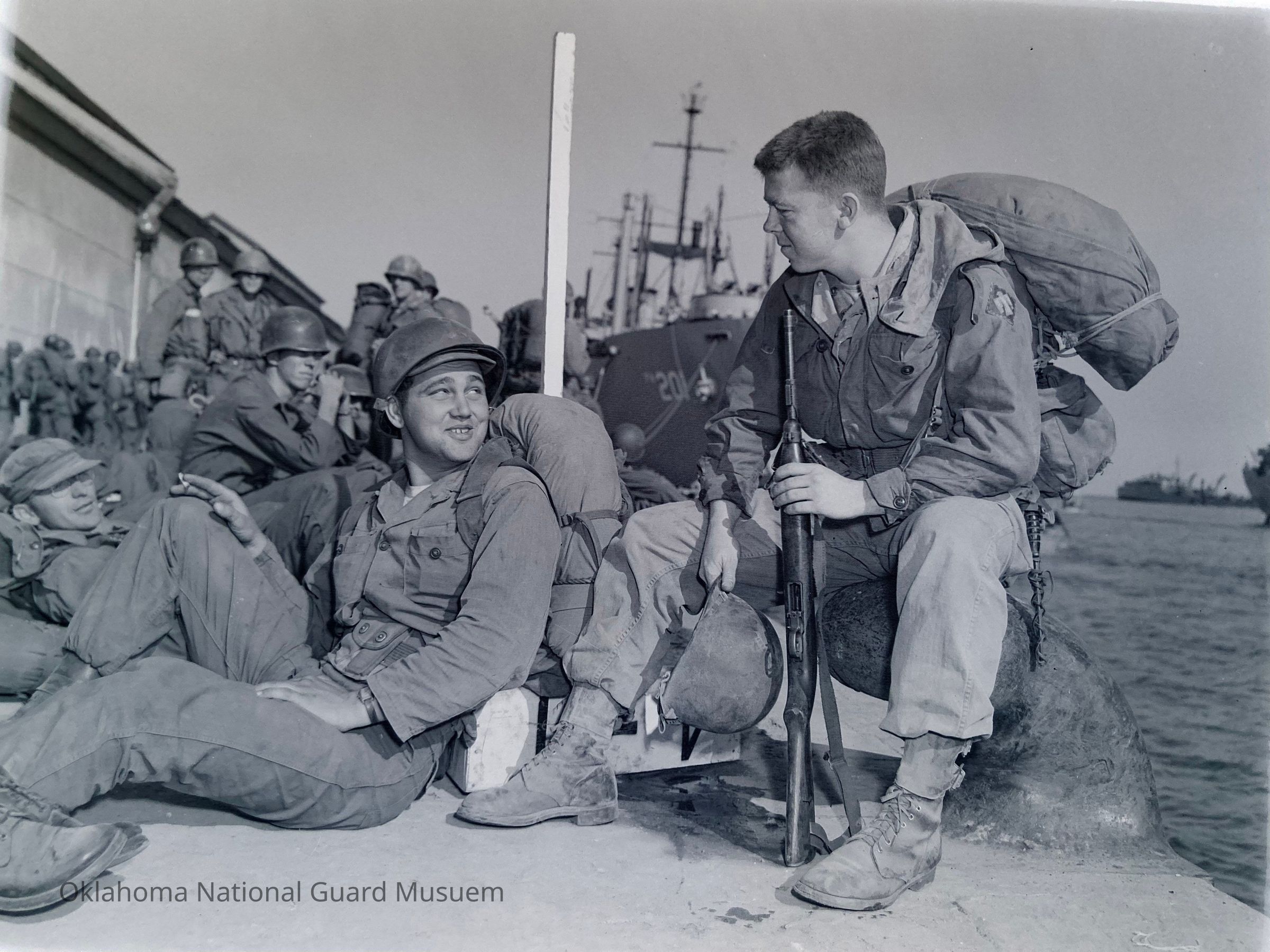 Soldiers with field gear lounging on a dock