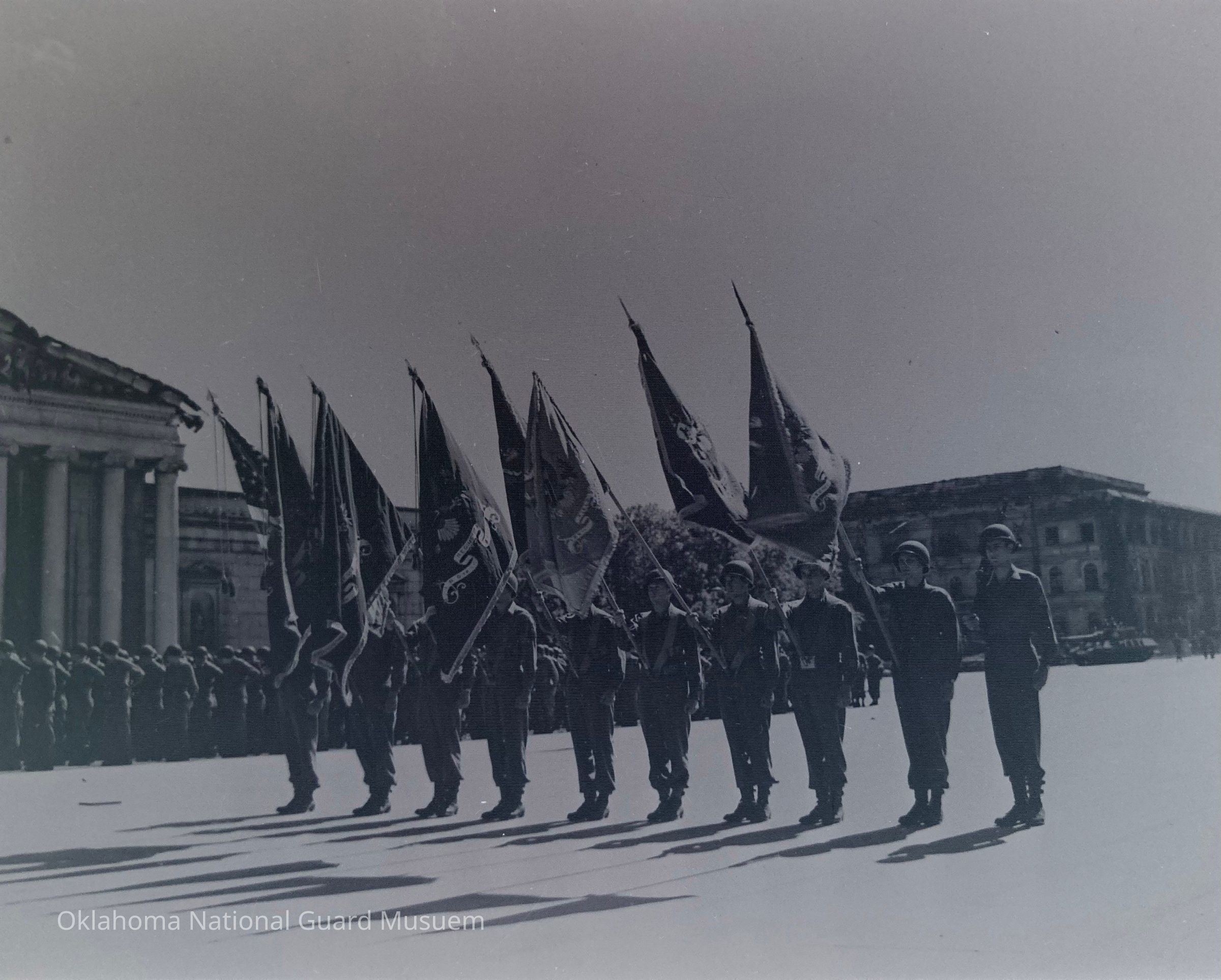 Soldiers with flags standing at attention