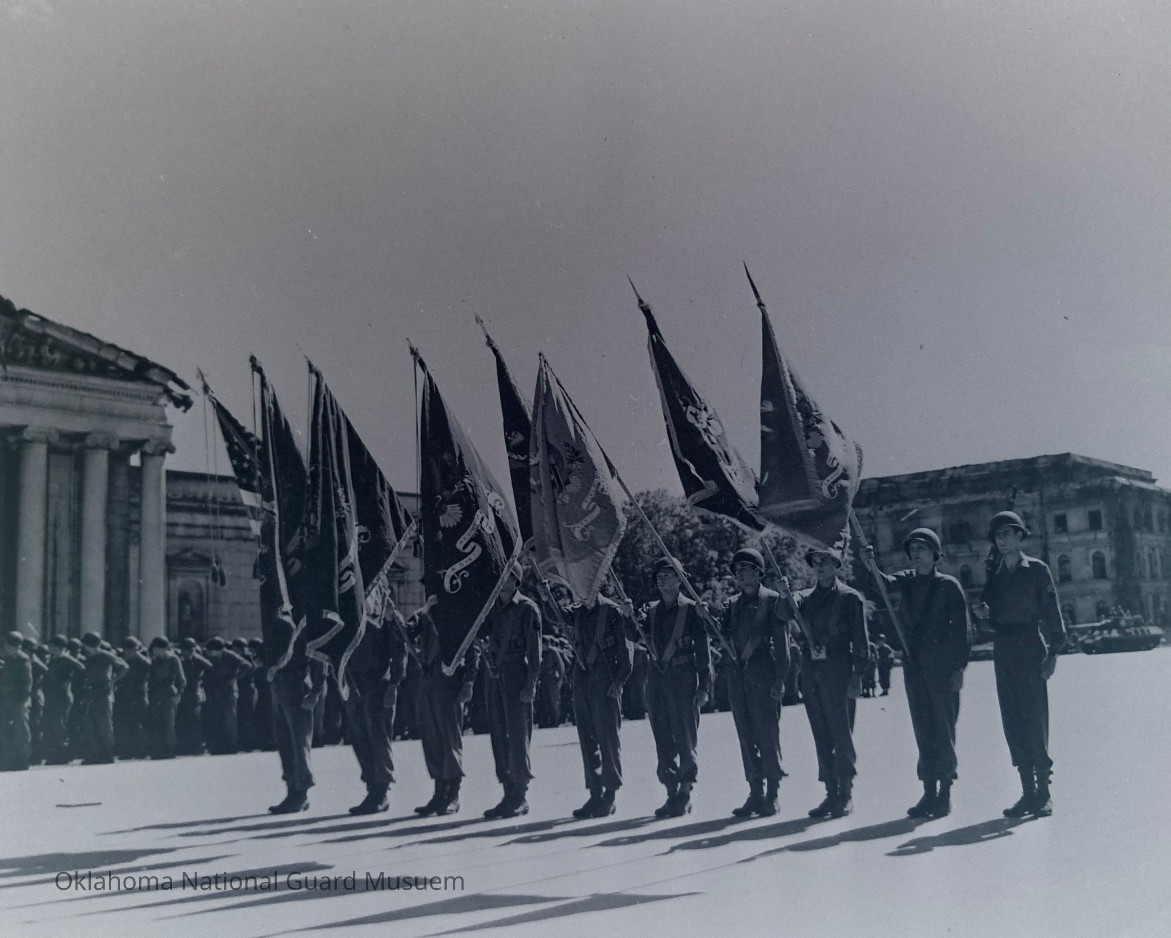 Soldiers with flags standing at attention