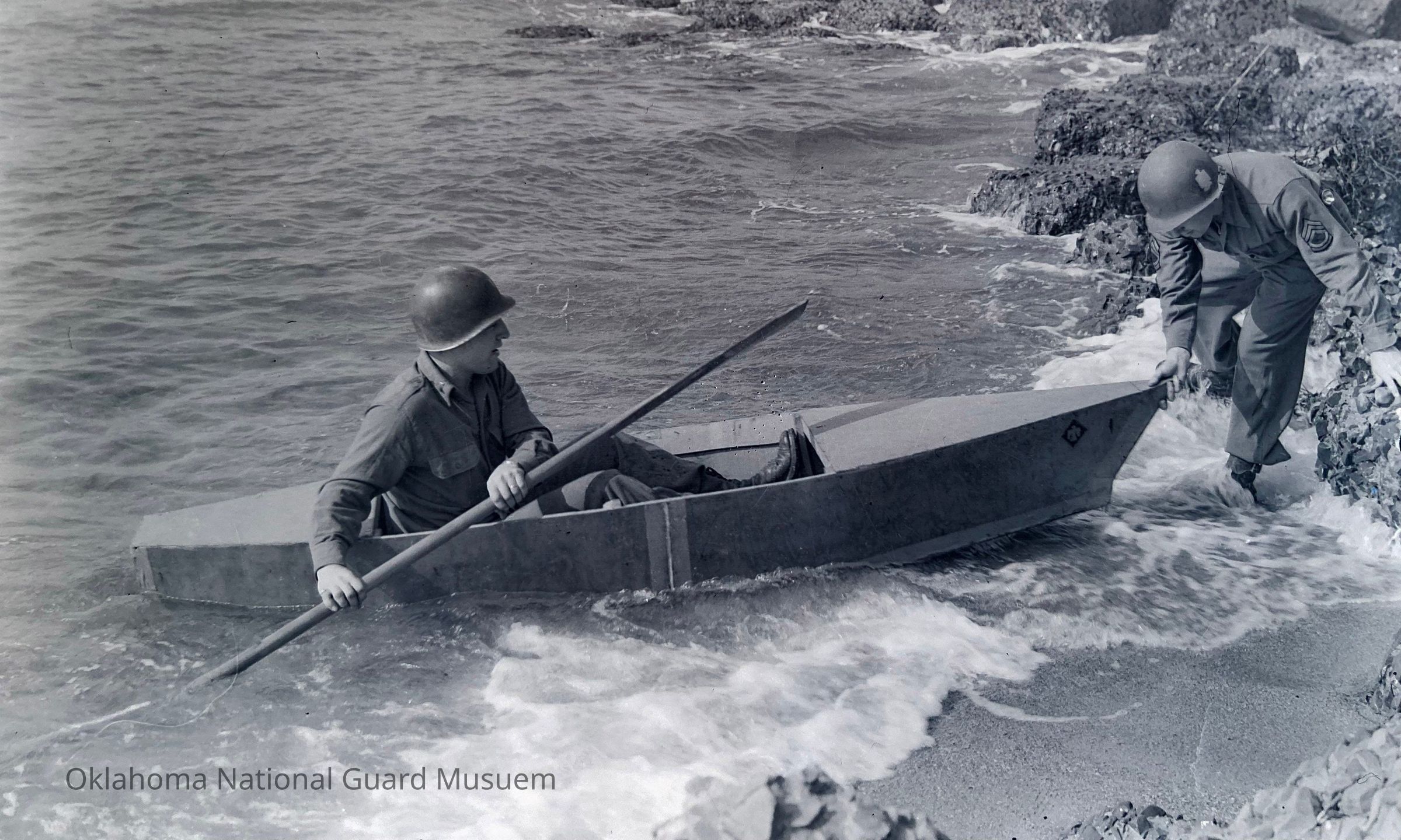 Photograph published in the 45th Division News,15 April 1944, Vol. IV, No.35, Caption "What's a beachhead without a canoe, asked Tech Sgt. Robert Townsend, Alva, OK, and 2nd Lt. Wallace Brondstatter, Wichita Falls, TX, set about to make one out of plywood and debris from bombed buildings. The pair glued together the Thunderbird I. As may have been suspected, mishap befell the craft. A short distance from shore, he was caught in an air raid and falling flak punctured the plywood boat. It sank. This photograph is the second venture after the canoe was patched. The Lt. is again at the paddle."Made/Created