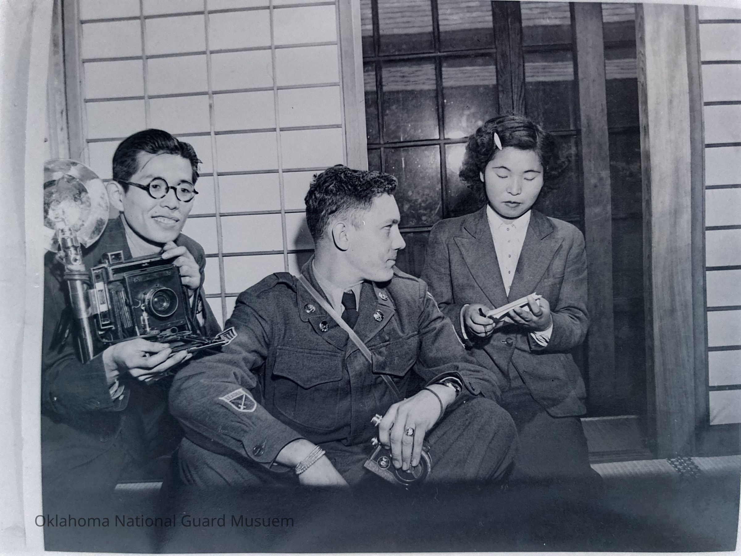 Soldiers with Japanese male photographer and a Japanese woman in a civilian building
