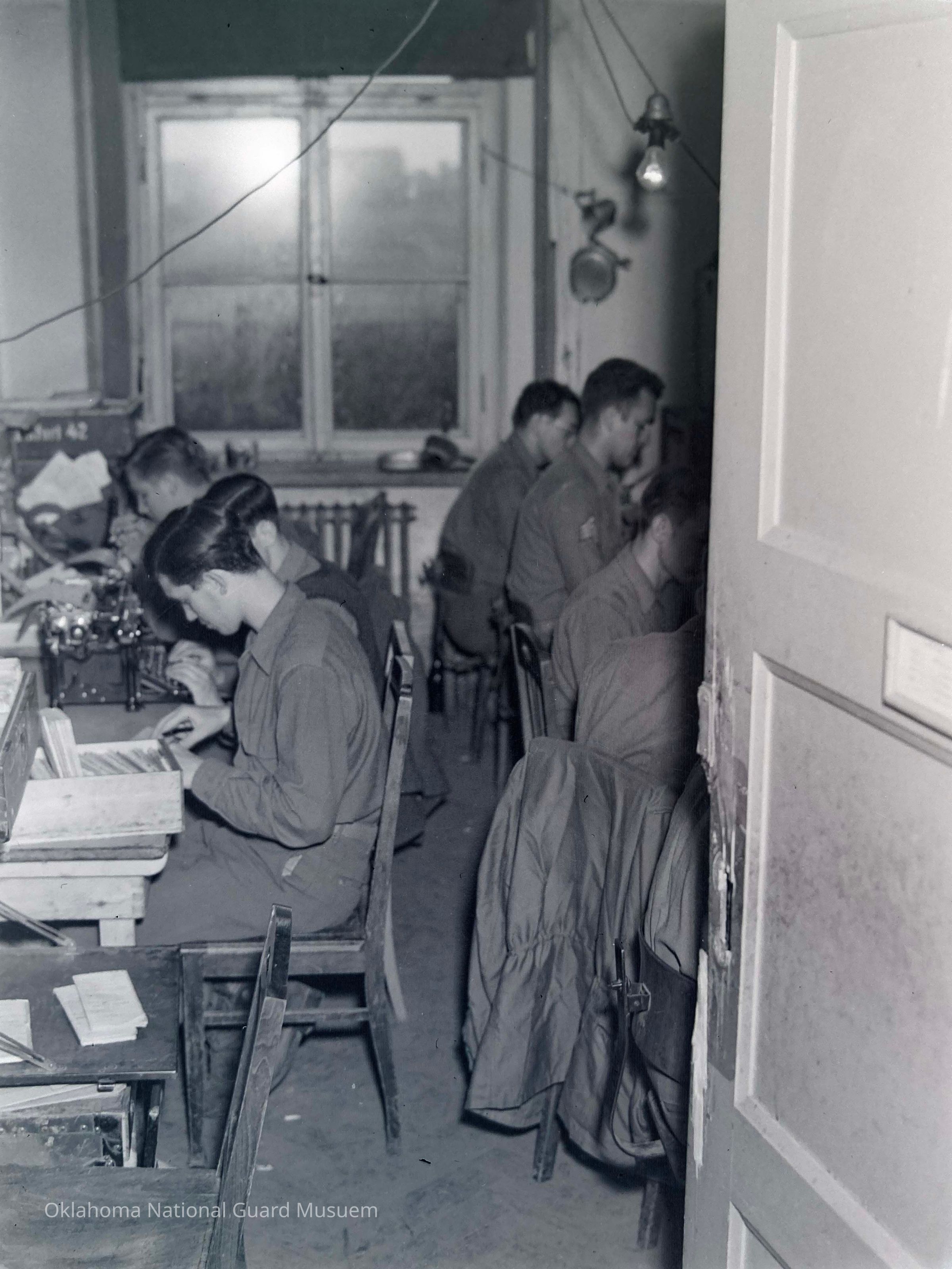 Negative of soldiers working at a desks
