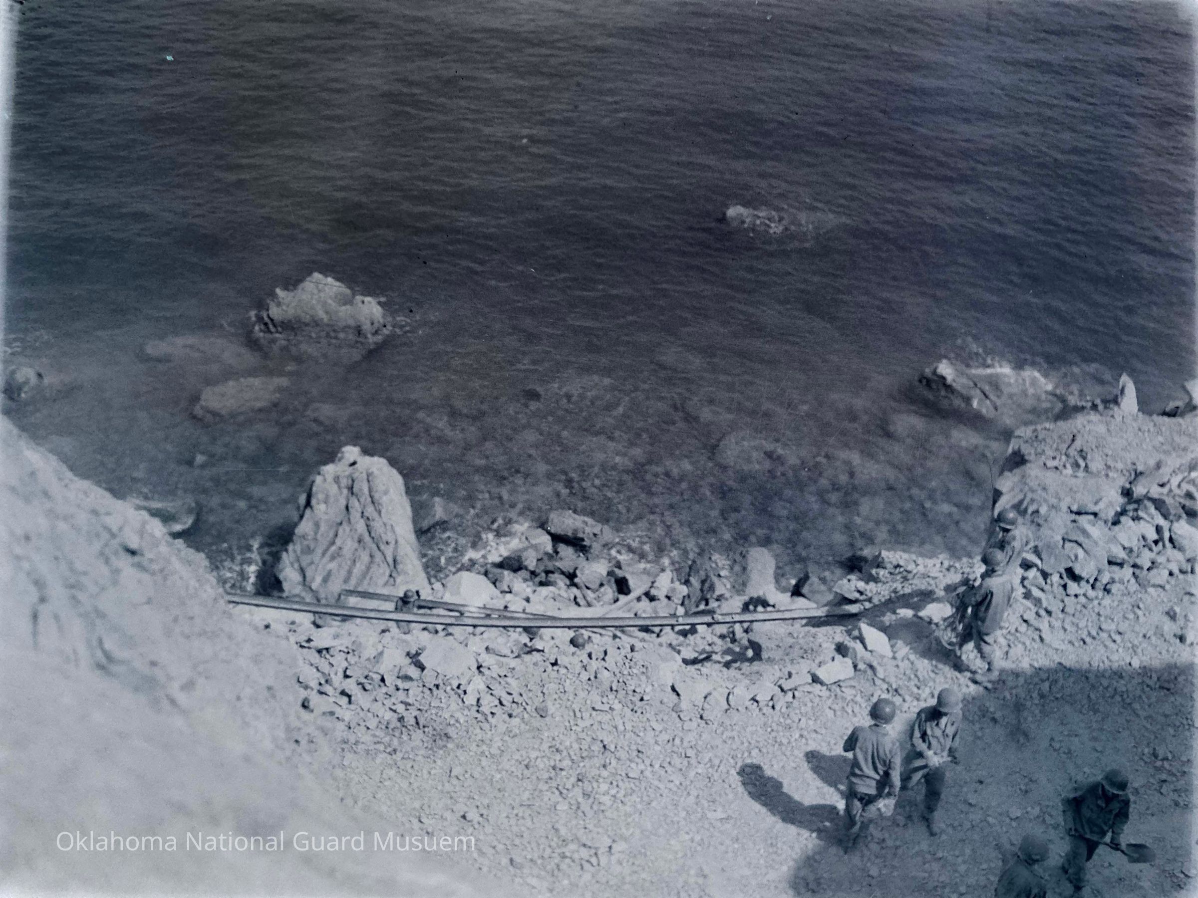 Negative of soldiers working on rocky beach