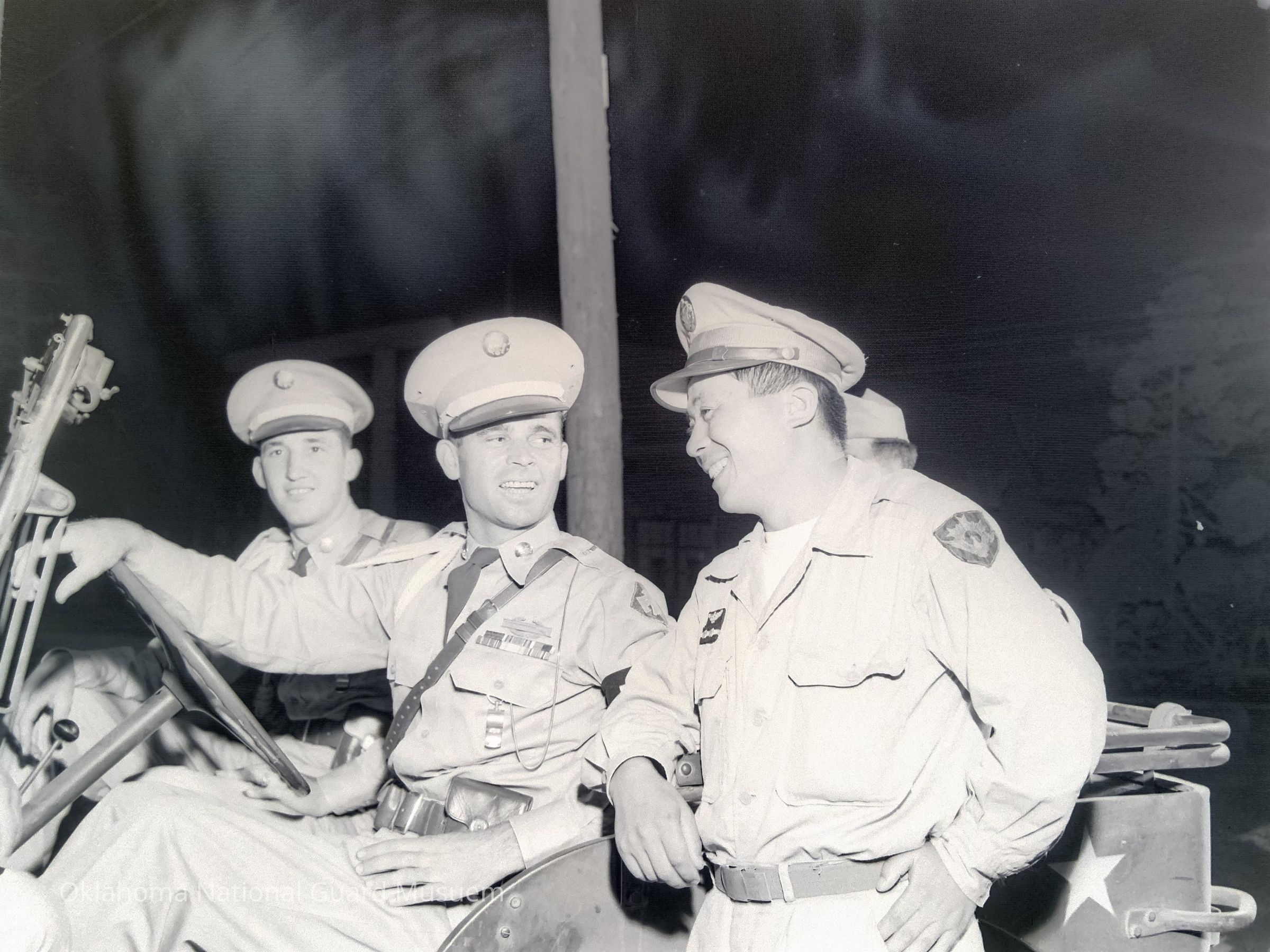 Negative of soldiers chatting with a member of the Japanese National Police Reserve on Hokkaido, Japan