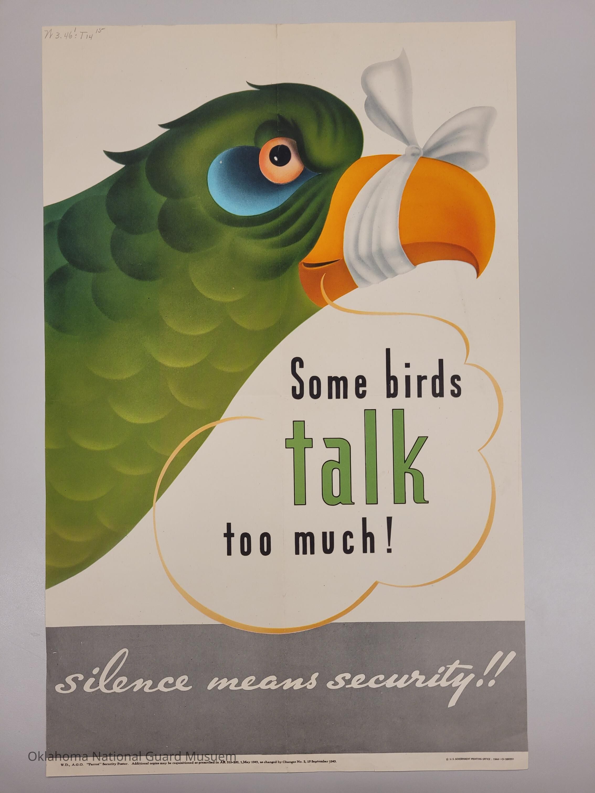 A green bird with its beak tied shut. Showing the viewer to not talk about war related subjectsCollection
