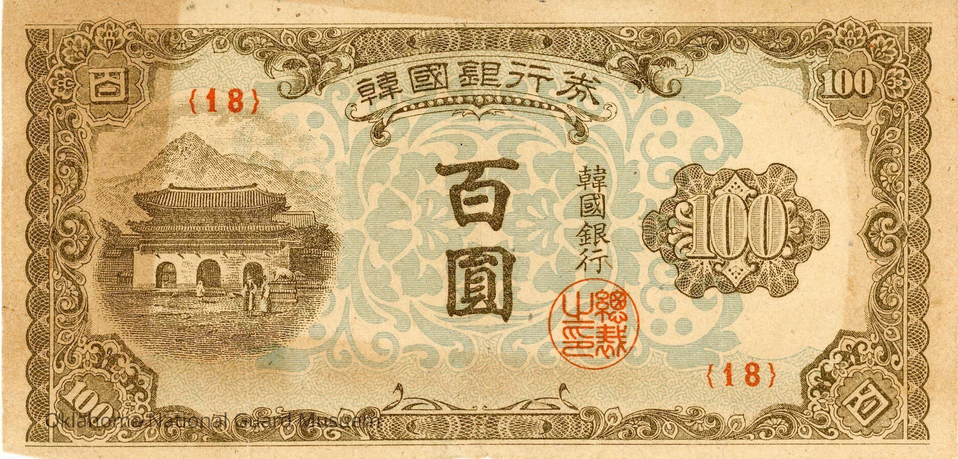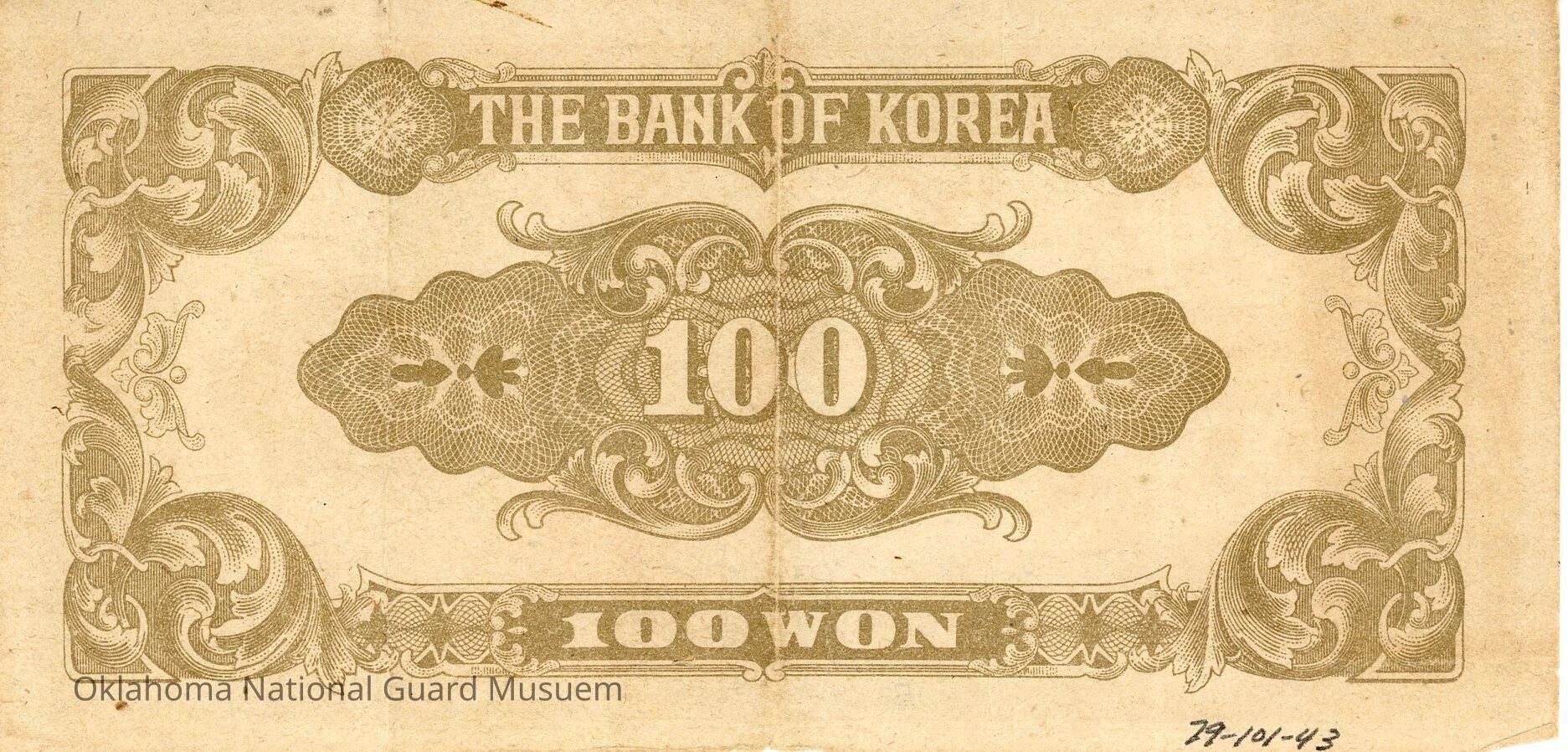 South Korean One Hundred Won-1950-1953. Accession number written on reverse in lower right