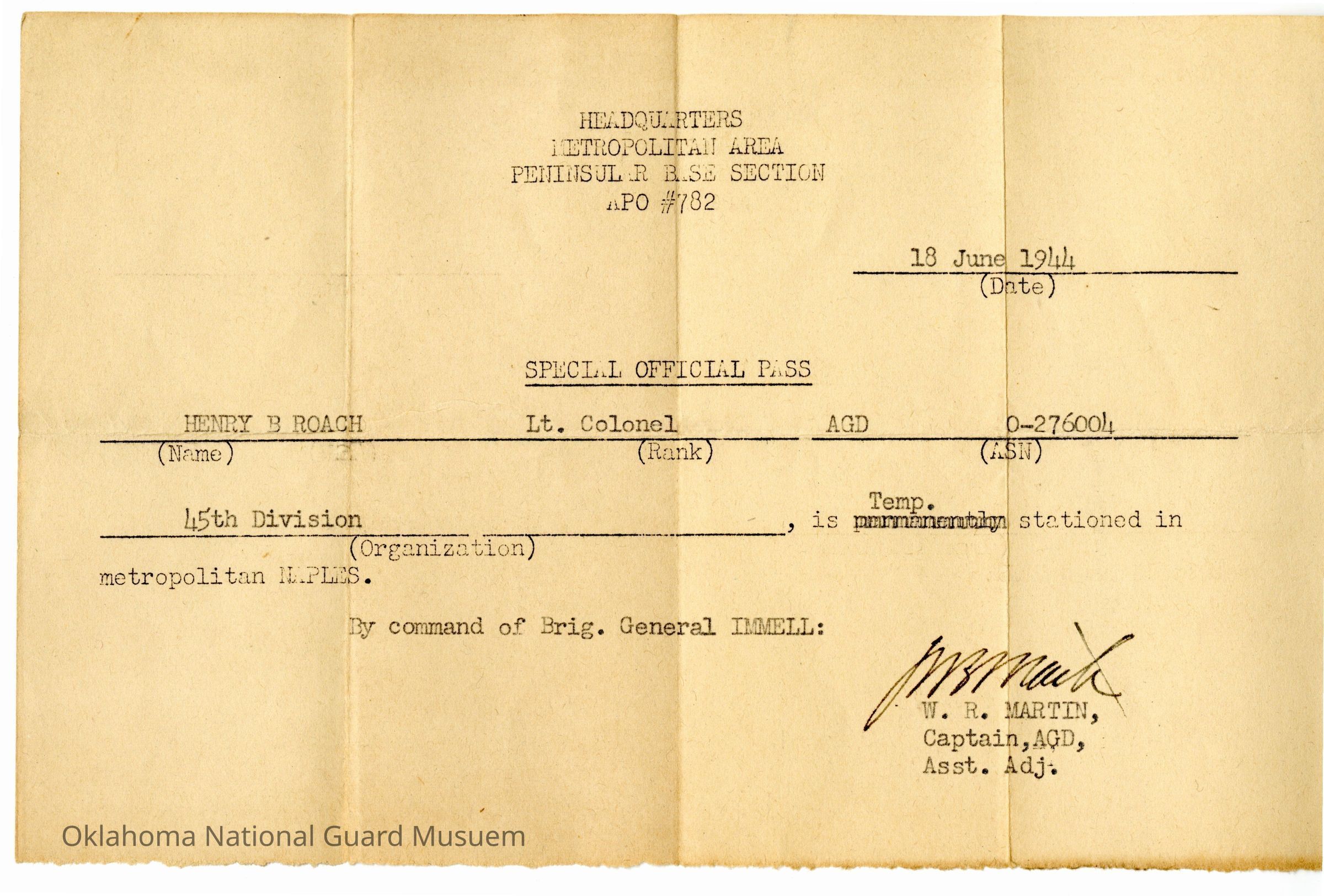 Special Official Pass for Henry B Roach (45th Division Adjutant). Temporary stationed in Headquarters Metropolitan Area Naples