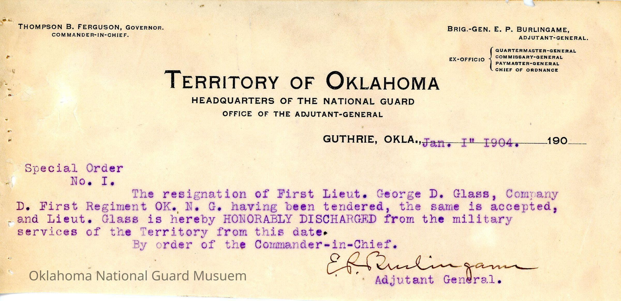 Adjutant General, Guthrie, E.P. Burlingame, Thompson B. Ferguson, First Regiment, Honorable discharges, George D. Glass