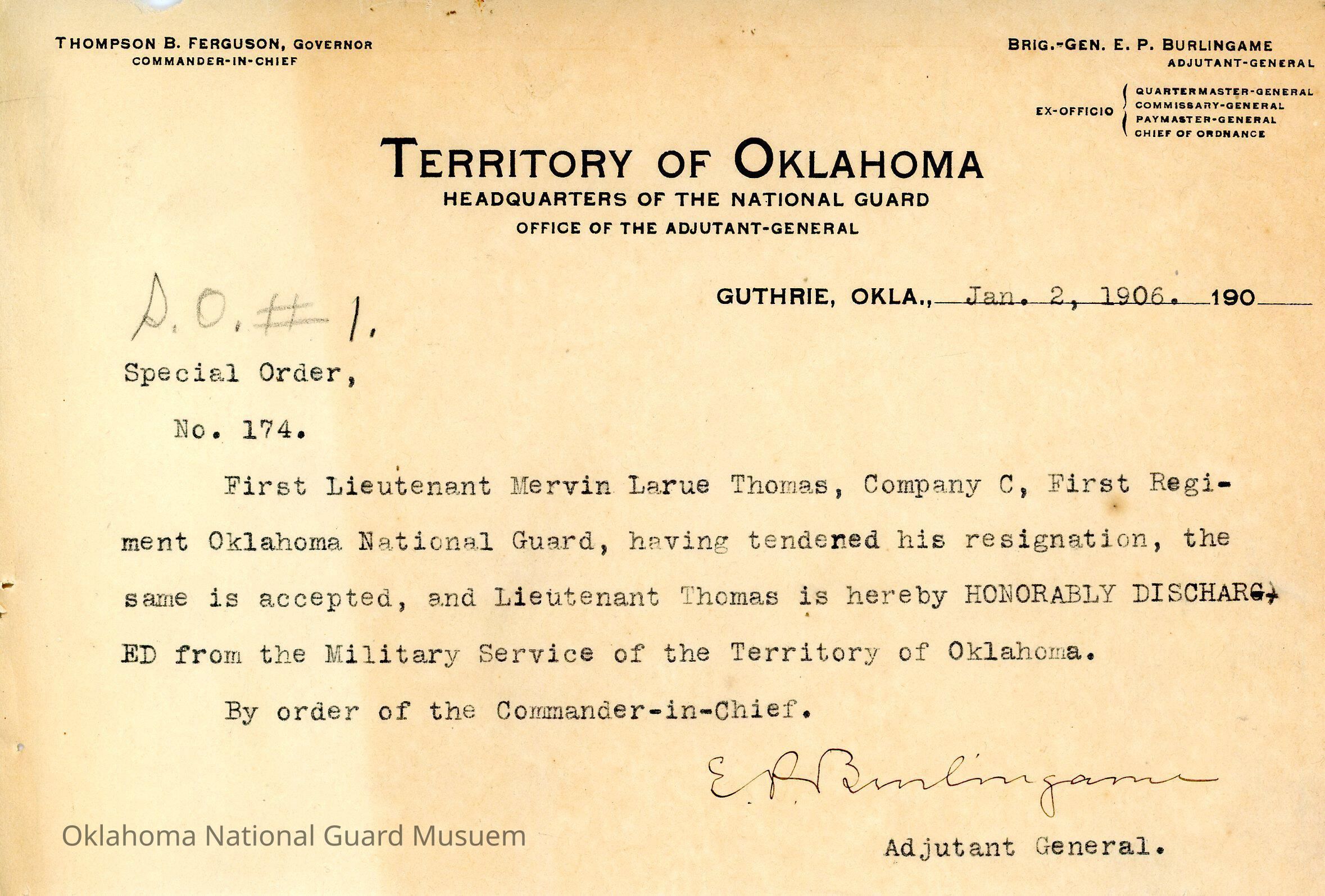 Adjutant General, Guthrie, E.P. Burlingame, Thompson B. Ferguson, First Regiment, Honorable discharges, Mervin Larue Thomas, Resignation