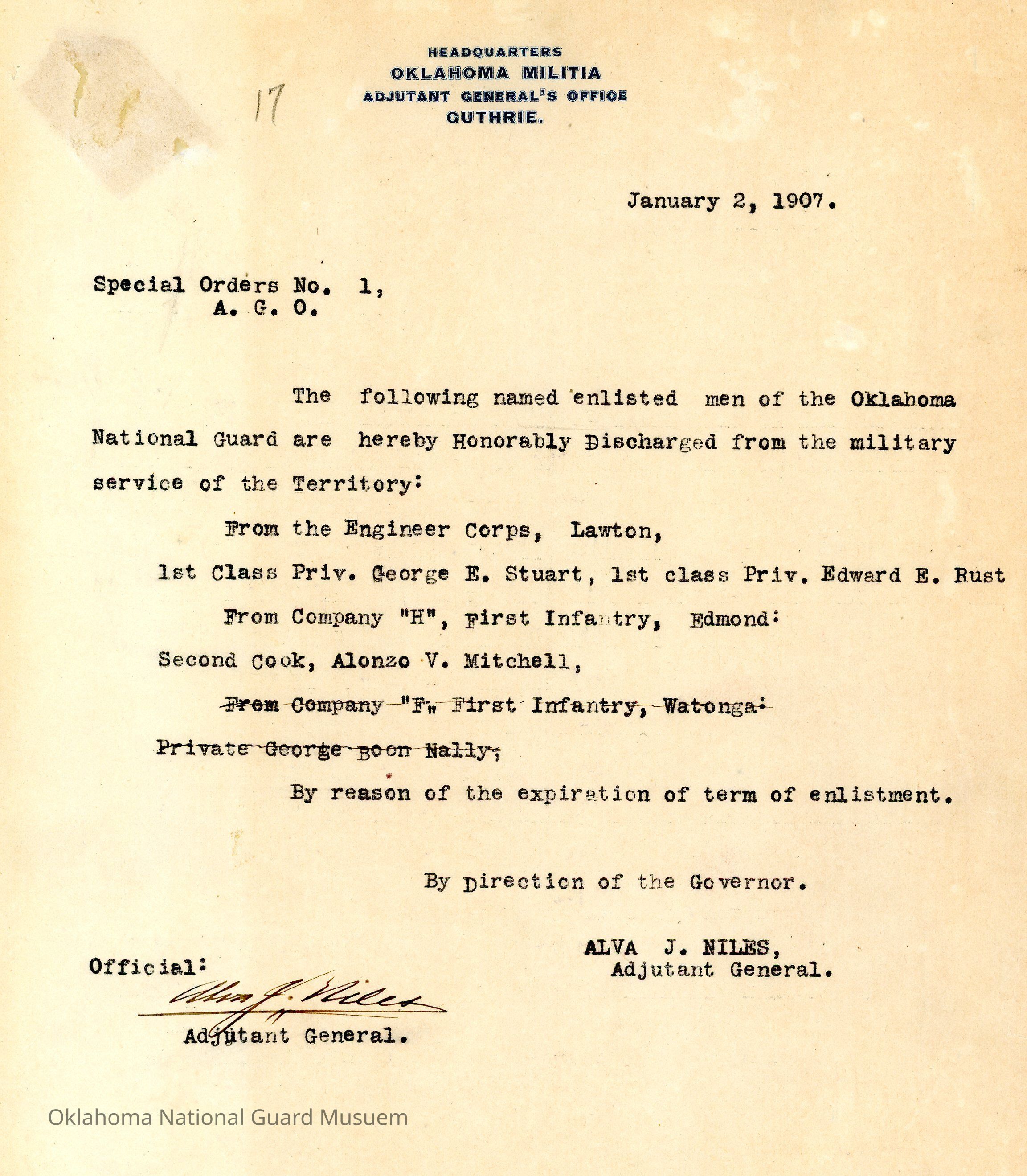 Adjutant General, Guthrie, Alva J. Niles, Honorable discharges, First Infantry, Engineer Corps, Lawton, George E. Stuart, Edward E. Rust, Edmond, Alonzo V. Mitchell