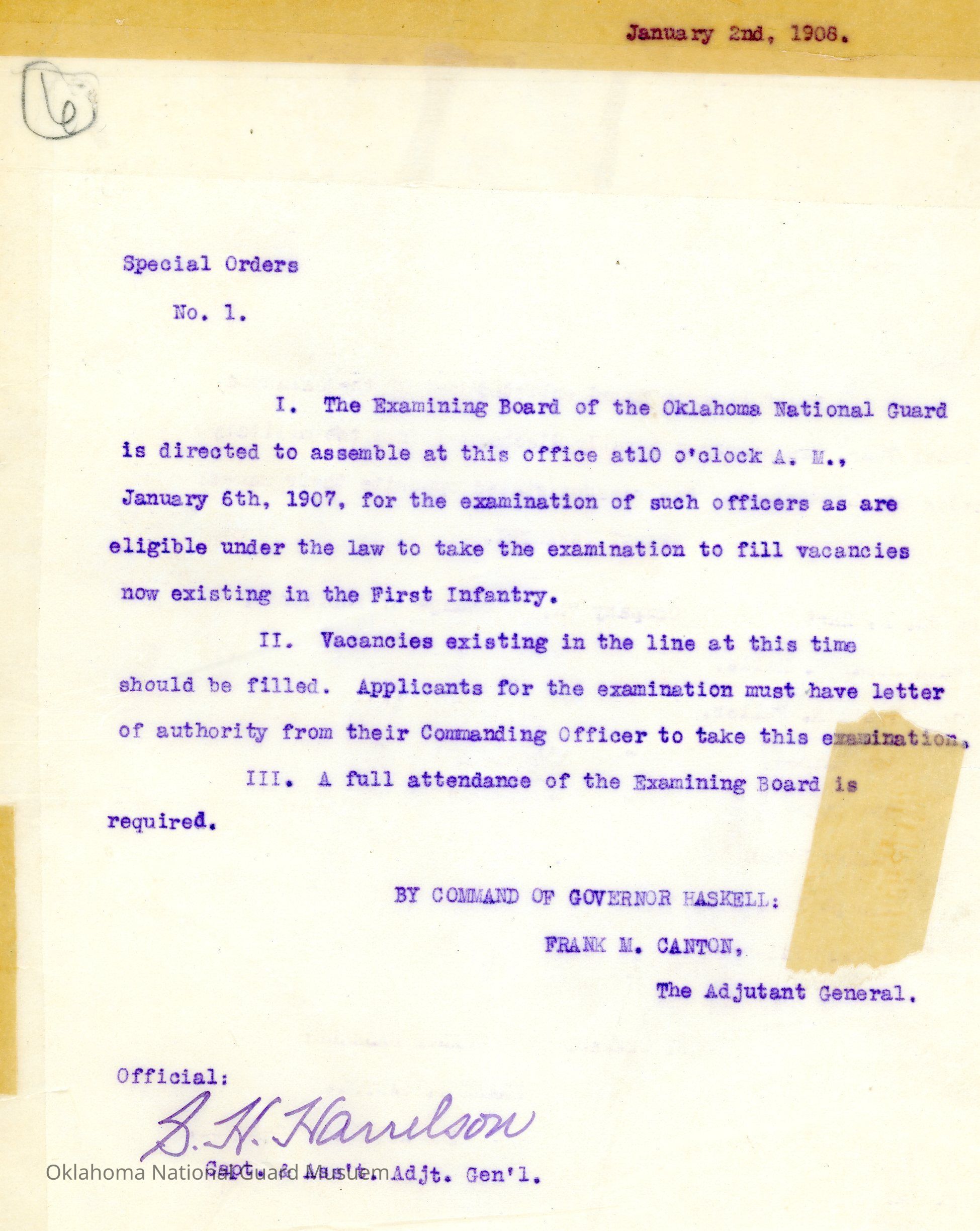 Special Order #1 from Headquarters Adjutant General's Office in Guthrie. The order instructs the Examining Board to meet at the office of the Adjutant General to fill vacancies existing in the First InfantryDate(s) of Creation
