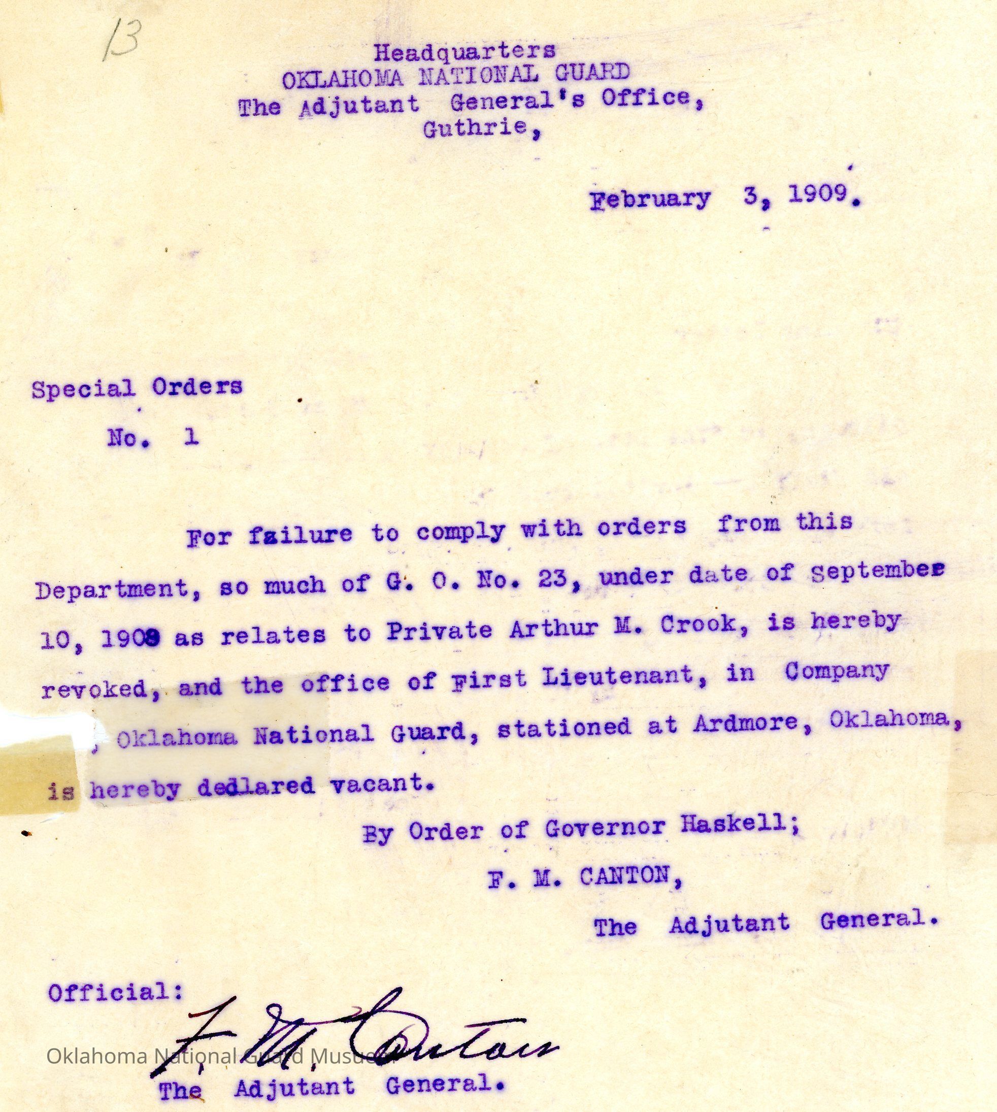 Special Order #1 from Headquarters Adjutant General's Office in Guthrie. The order rescinds General Order #23 1908 related to Arthur M. Crook and the office of First Lieutenant stationed in Ardmore is declared vacantDate(s) of Creation