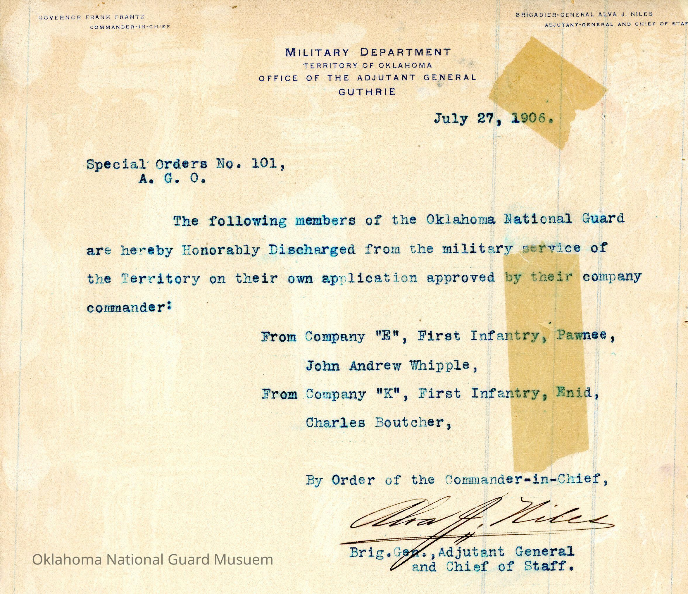 Adjutant General, Guthrie, Frank Frantz, Alva J. Niles, First Infantry, Honorable discharges, John Andrew Whipple, Charles Boutcher