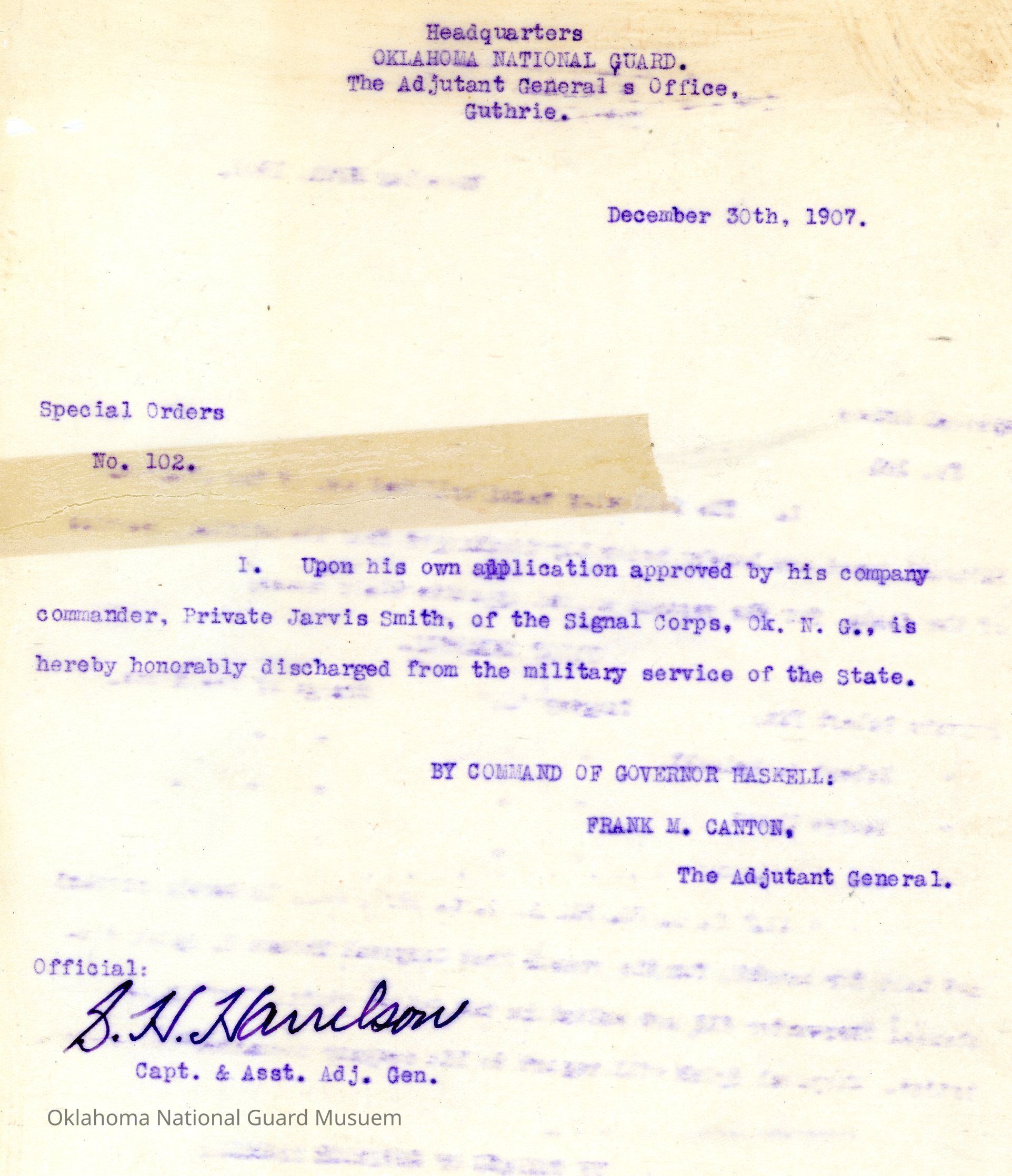 Adjutant General, Guthrie, Frank Canton, Charles N. Haskell, Signal Corps, Honorable discharges, Jarvis Smith