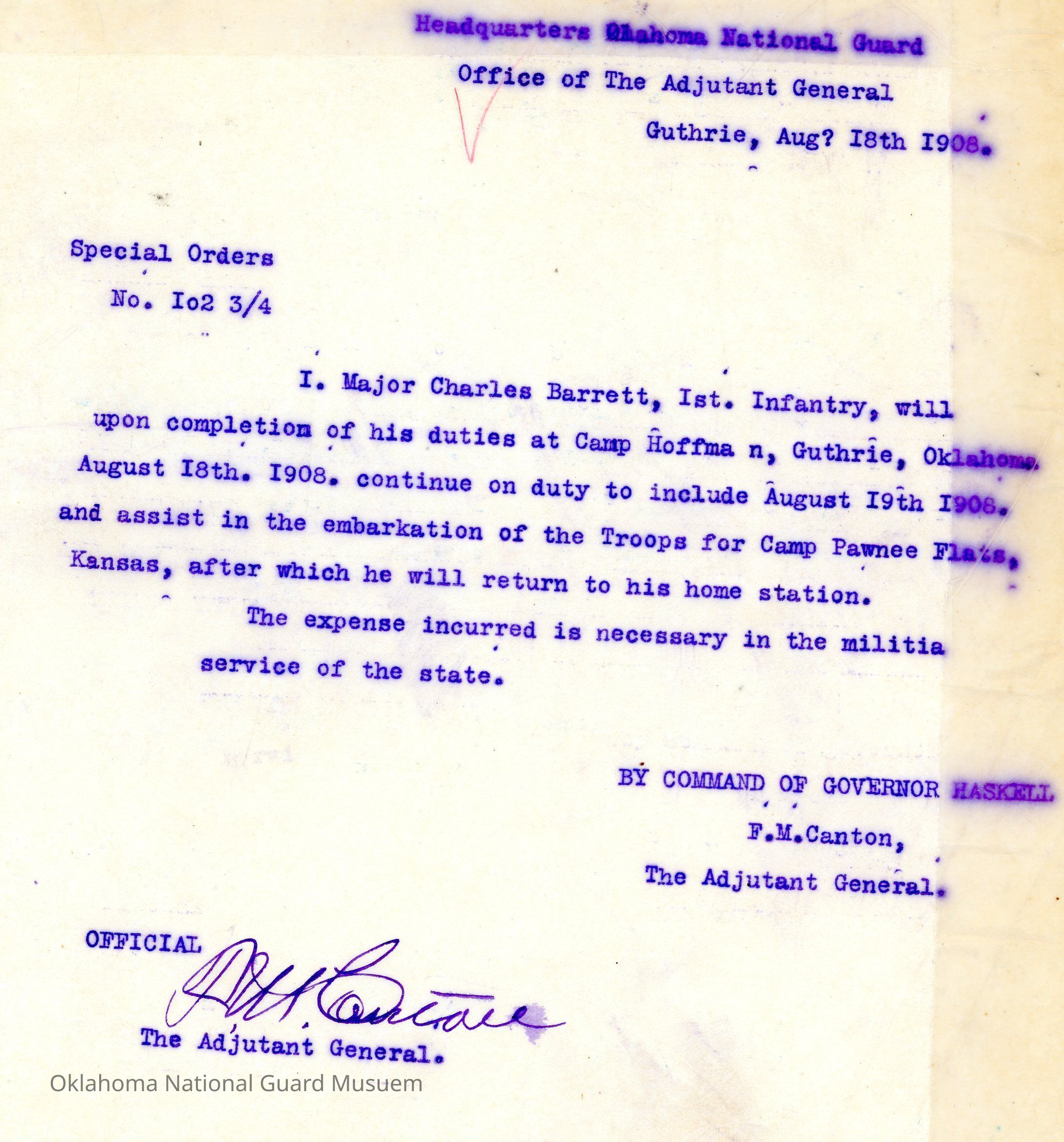 Special Order #102.75 from Headquarters Adjutant General's Office in Guthrie. The order instructs Charles Barrett, after finishing his duties at Camp Hoffman, assist in the embarkation of the Oklahoma National Guard for Camp Pawnee Falts, KansasDate(s) of Creation