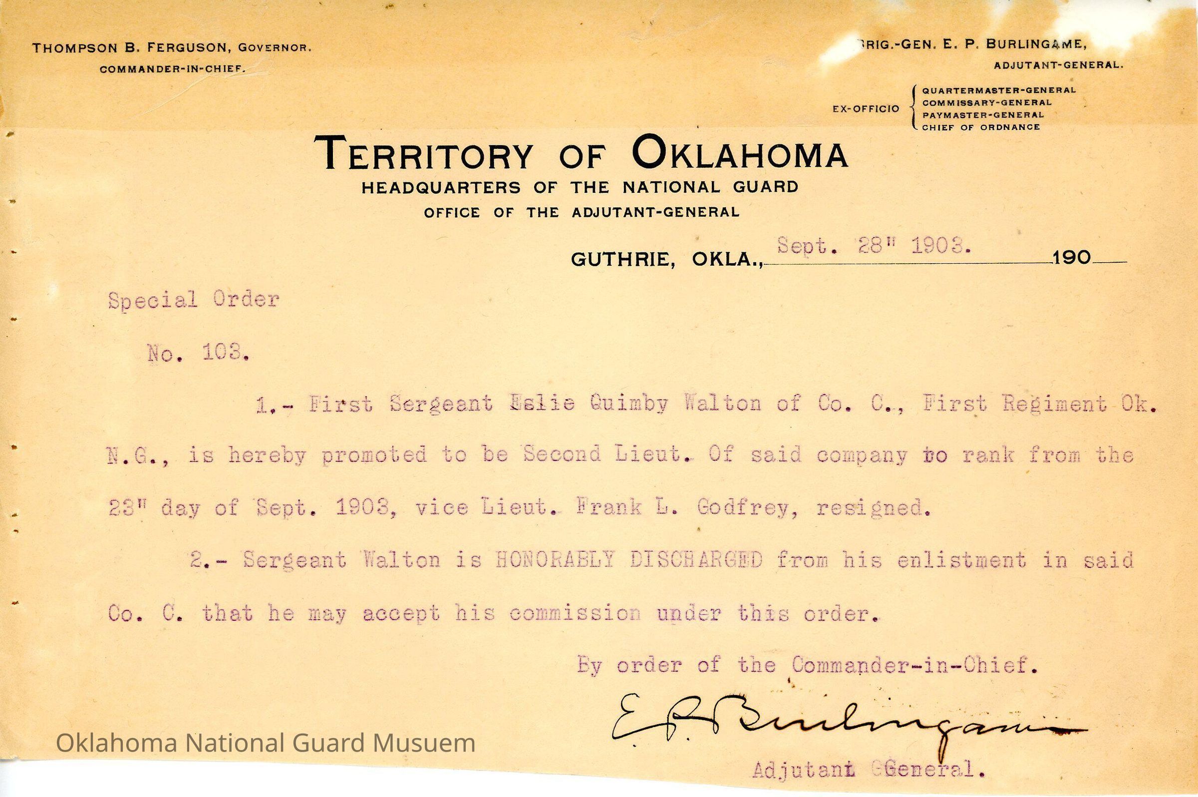 Adjutant General, Guthrie, E.P. Burlingame, Thompson B. Ferguson, Honorable discharge, Promotion, Eslie Quimby, Frank L. Godfrey