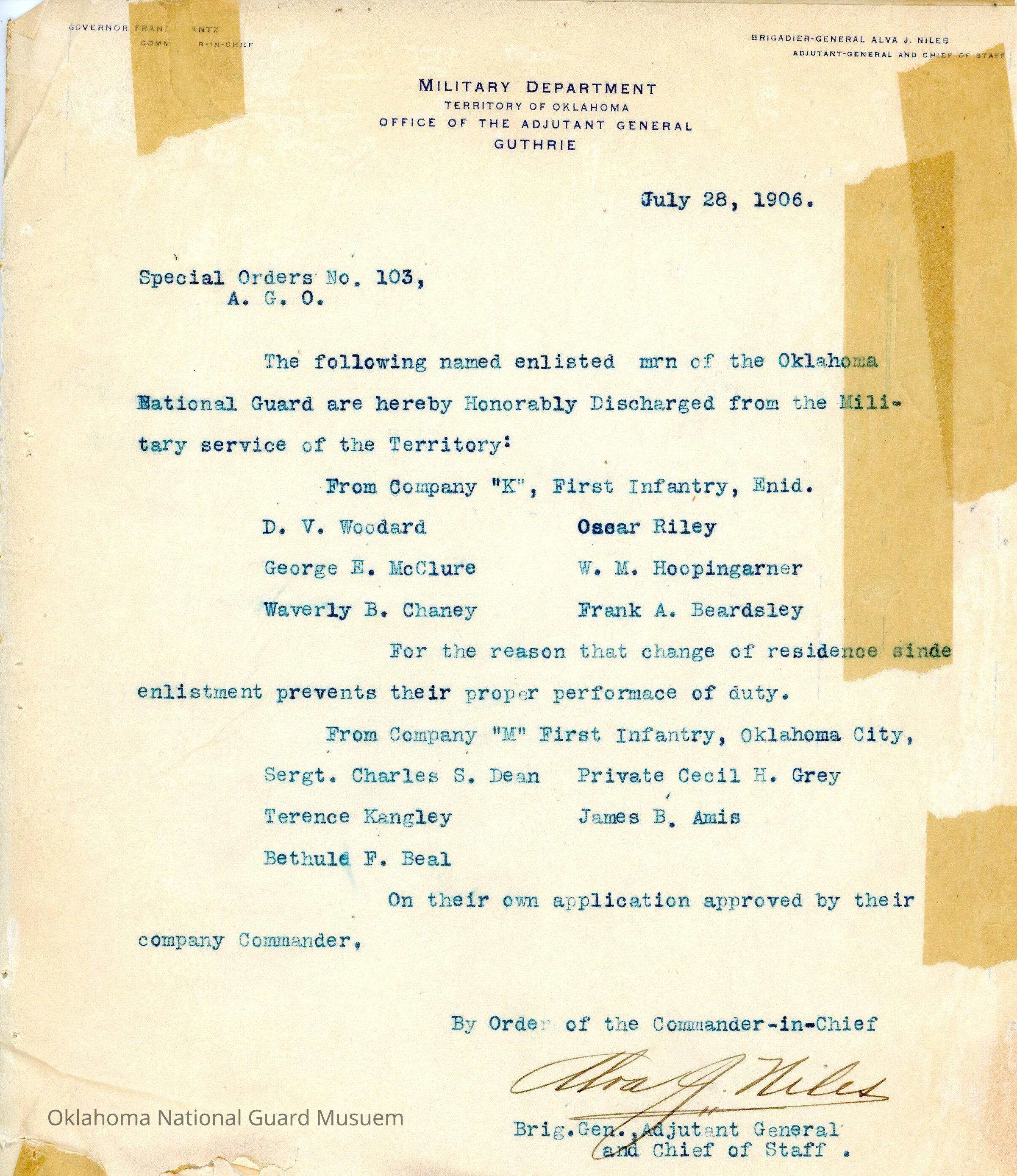 Adjutant General, Guthrie, Frank Frantz, Alva J. Niles, First Infantry, Honorable discharges, D.V. Woodard, George E. McClure, Waverly B. Chaney, Oscar Riley, W.M. Hoopingarner, Frank A. Beardsley, Charles S. Dean, Terence F. Beal, Bethule F. Beal, Cecil H. Grey, James B. Amis