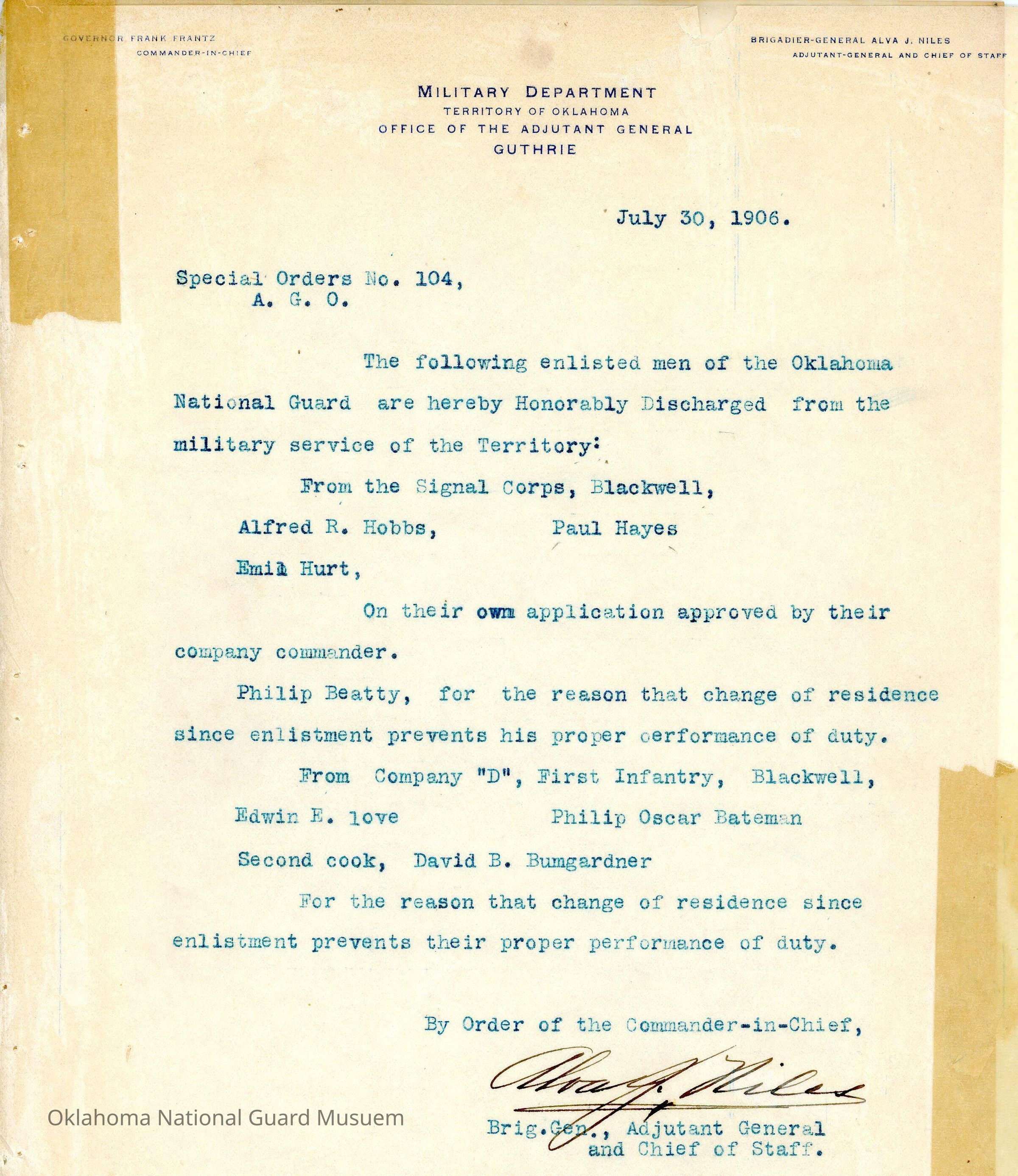 Special Order #104 from Headquarters Adjutant General's Office in Guthrie. The order lists the honorable discharges in First Infantry and Signal CorpsDate(s) of Creation
