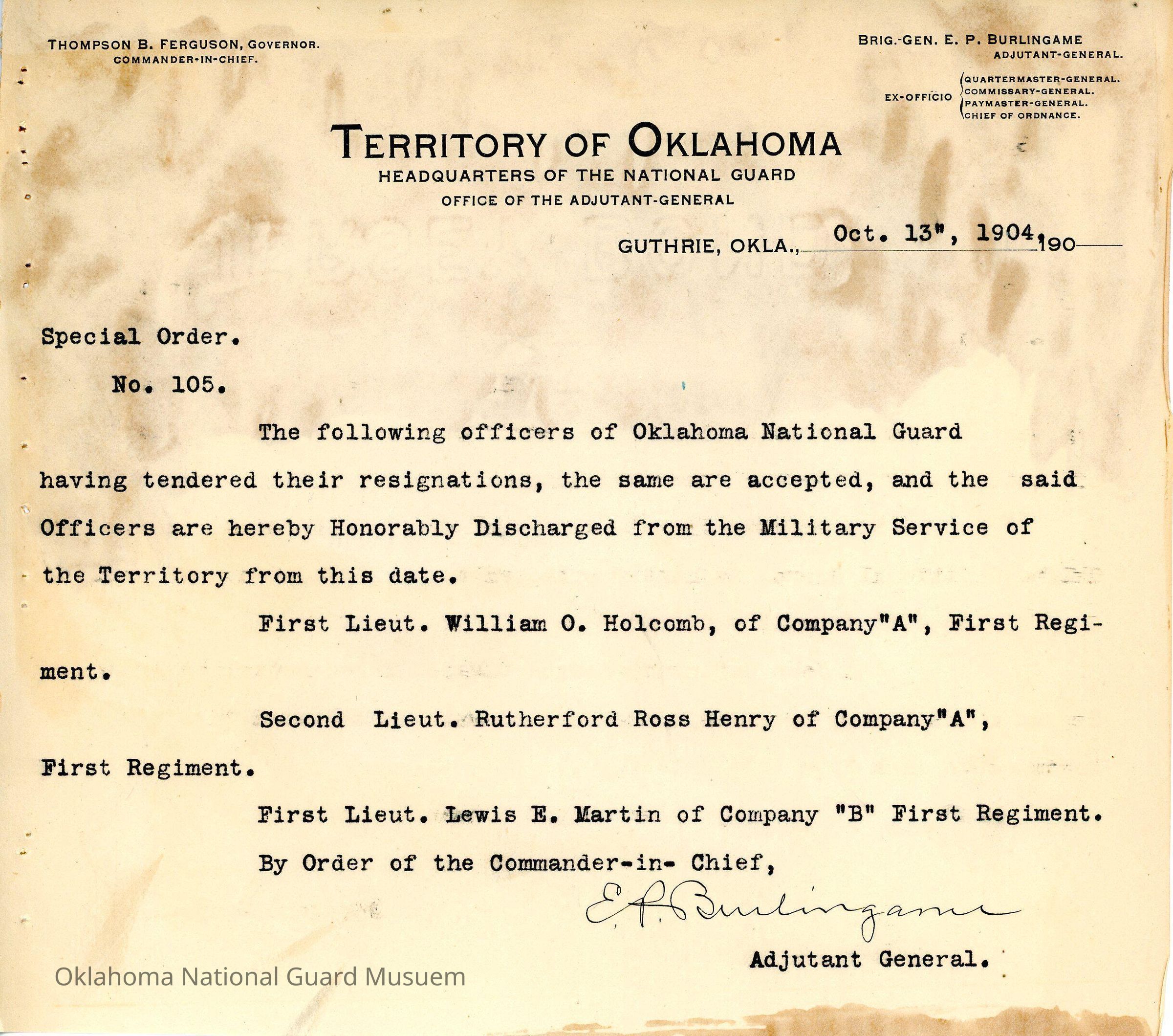 Adjutant General, Guthrie, E.P. Burlingame, Thompson B. Ferguson, First Regiment, Honorable discharges, Resignation, William O. Holcomb, Rutherford Ross Henry, Lewis E. Martin