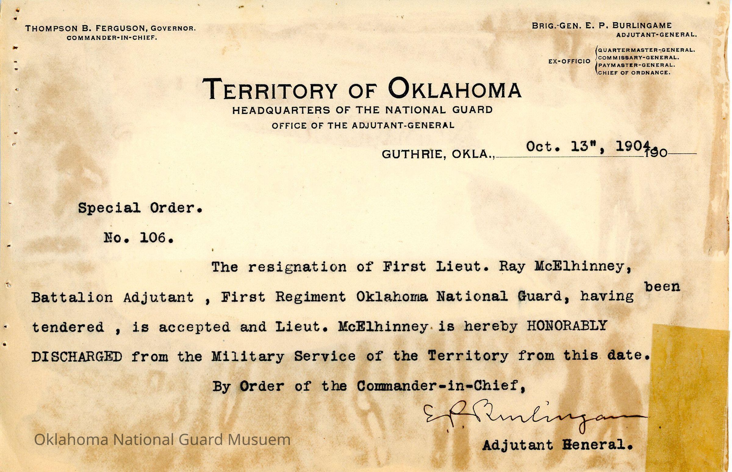 Adjutant General, Guthrie, E.P. Burlingame, Thompson B. Ferguson, First Regiment, Honorable discharges, Resignation, Ray McElhinney