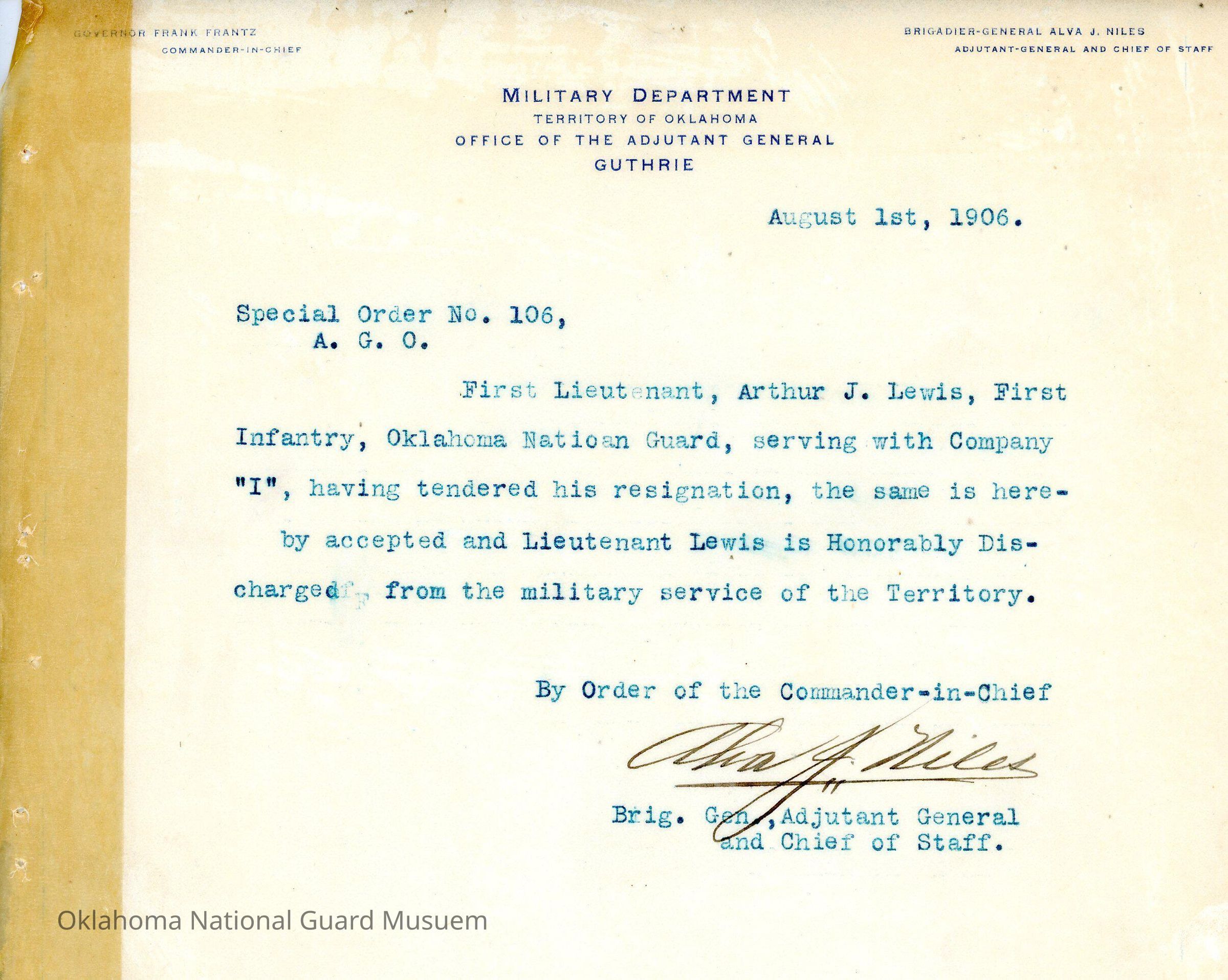 Adjutant General, Guthrie, Frank Frantz, Alva J. Niles, First Infantry, Honorable discharges, Resignation, Arthur J. Lewis