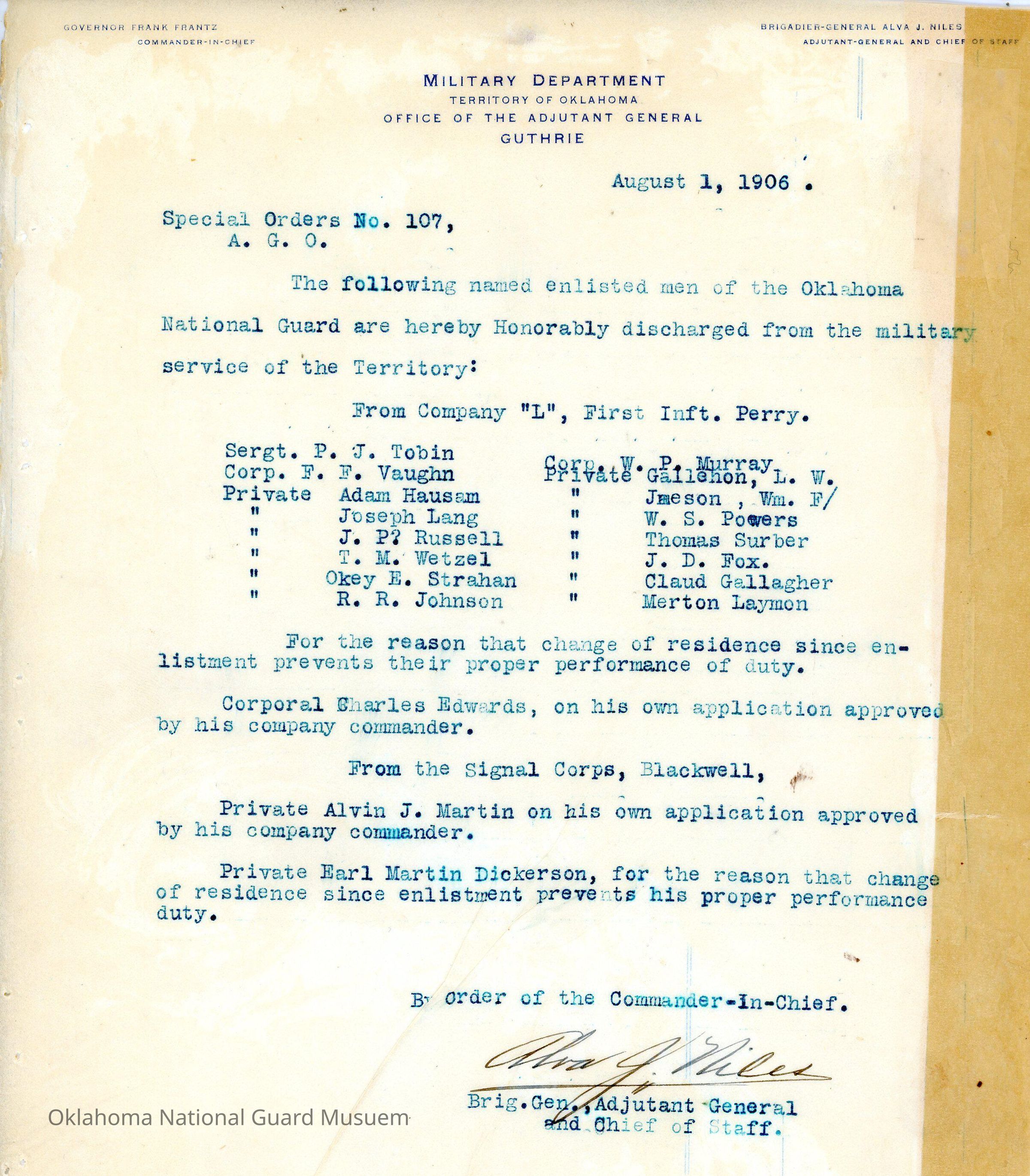 Special Order #107 from Headquarters Adjutant General's Office in Guthrie. The order lists the honorable discharges in First Infantry and Signal CorpsDate(s) of Creation