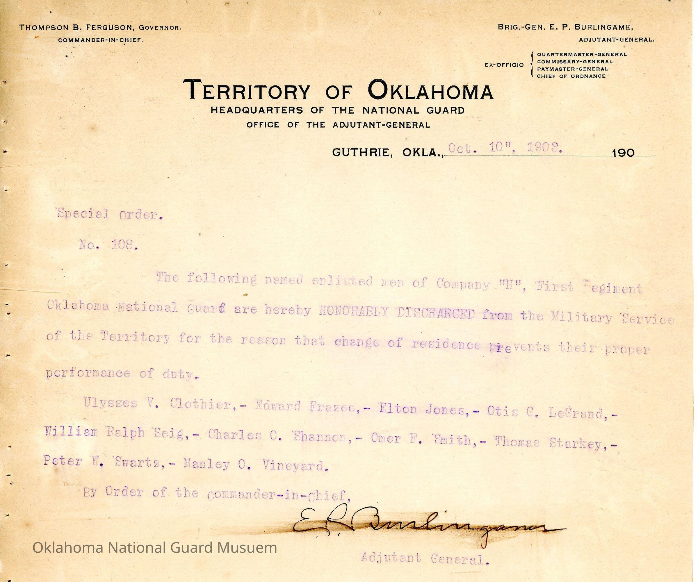 Adjutant General, Guthrie, E.P. Burlingame, Thompson B. Ferguson, First Regiment, Honorable discharge, Ulysses V. Clothier, Edward Frazee, Elton Jones, Otis G. LeGrand, William Ralph Seig, Charles O. Shannon, Omer F. Smith, Thomas Starkey, Peter W. Swartz, Manley O. Vineyard