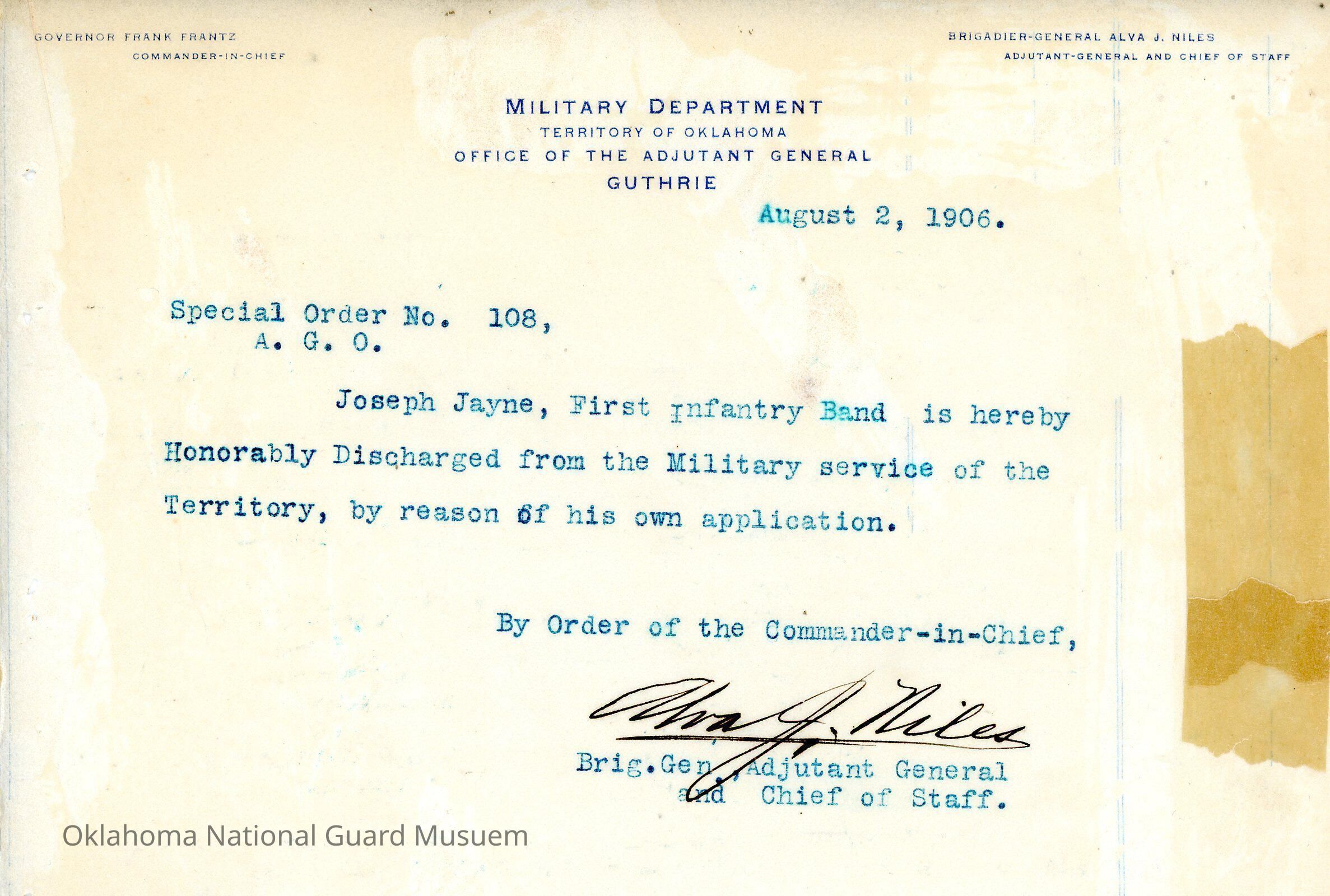 Adjutant General, Guthrie, Frank Frantz, Alva J. Niles, First Infantry Band, Honorable discharges, Joseph Jayne