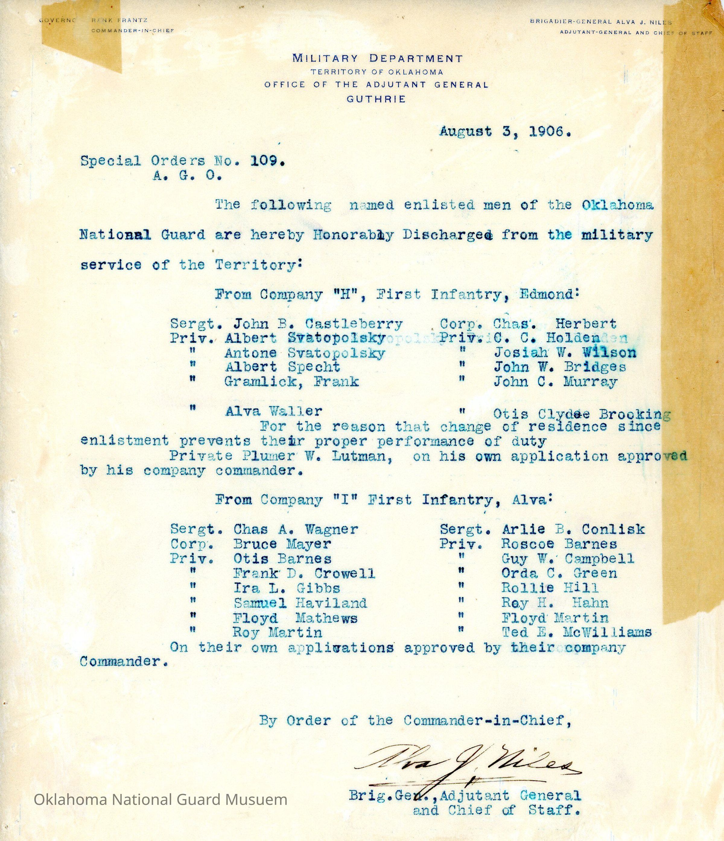 Special Order #109 from Headquarters Adjutant General's Office in Guthrie. The order lists the honorable discharges in First InfantryDate(s) of Creation